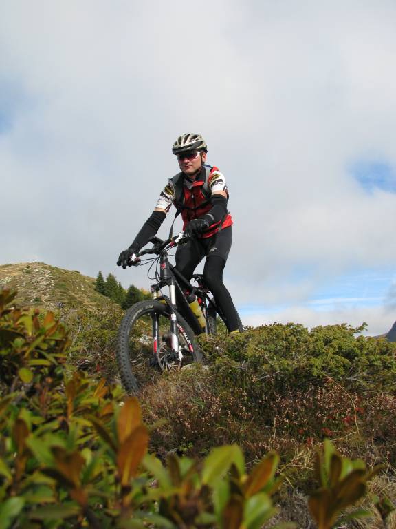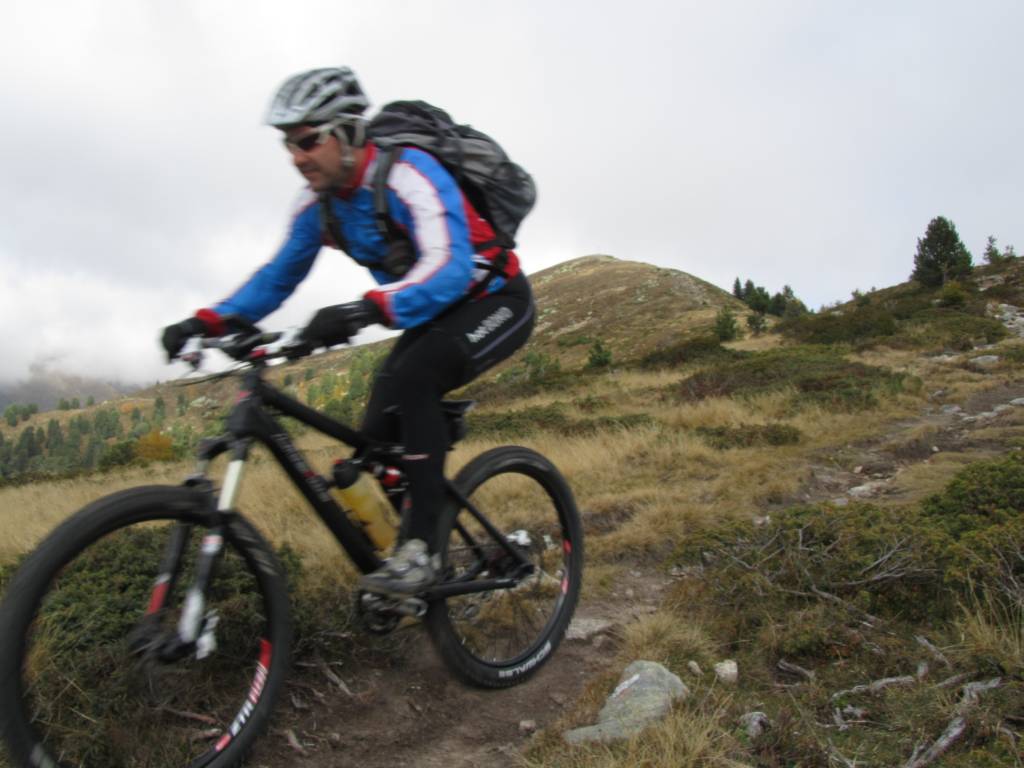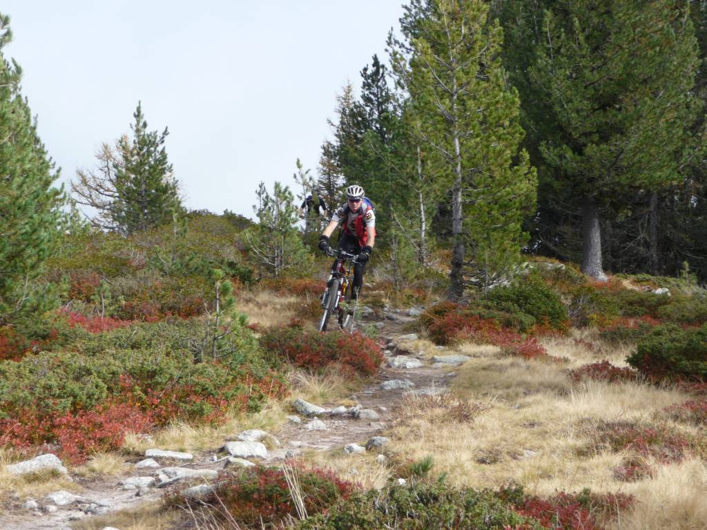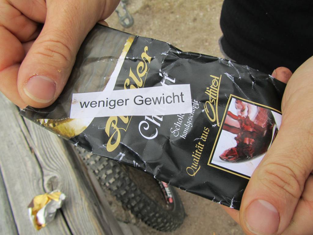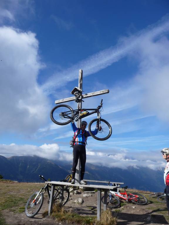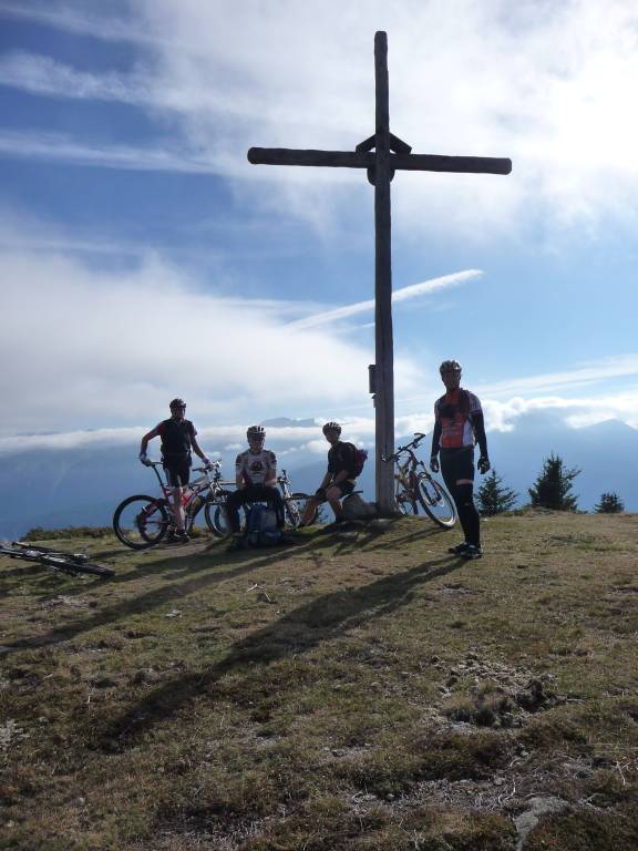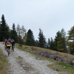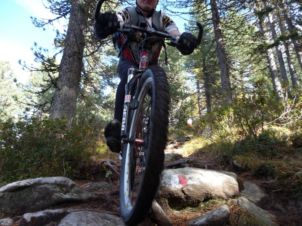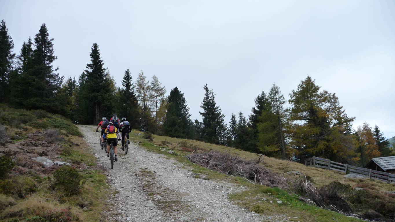 Am Parkplatz zur Taistner Alm angekommen gab es einen kurzen Kriegsrat, da für die Heimfahrt 2 unterschiedliche Wege zur Verfügung standen. Aufgrund seines Namens entschieden wir uns für den Lottersteig. Der erste Teil der Steigs war auch so, wie man sich einen Steig vorstellt: Spassig zu fahren, ohne große Schwierigkeit, aber trotzdem sollte man bei der Sache bleiben. Hier kam auch die Stelle, an der der Ladi zum ersten Mal an diesem Wochenende (er sollte es am zweiten Tag wiederholen) die Wiederverschließbarkeit seiner Tubeless-Reifen testete: nach einer etwas harten Landung am Vorderreifen entwich diesem für einen Moment gut hörbar Luft, aber der Reifen war dann gleich wieder dicht. Die zweite Hälfte des Lottersteigs war dann leider nur mehr ein Forstweg und insofern auch nicht mehr ganz so spannend zu fahren. Trotzdem haben wir auch hier etwas gelernt: verschreckte Kälber sind in der Lage über einen elektrischen Zaun zu springen (es waren sehr schreckhafte Kälber, denn wir haben uns diesen wirklich sehr langsam genähert).