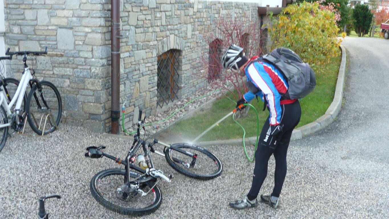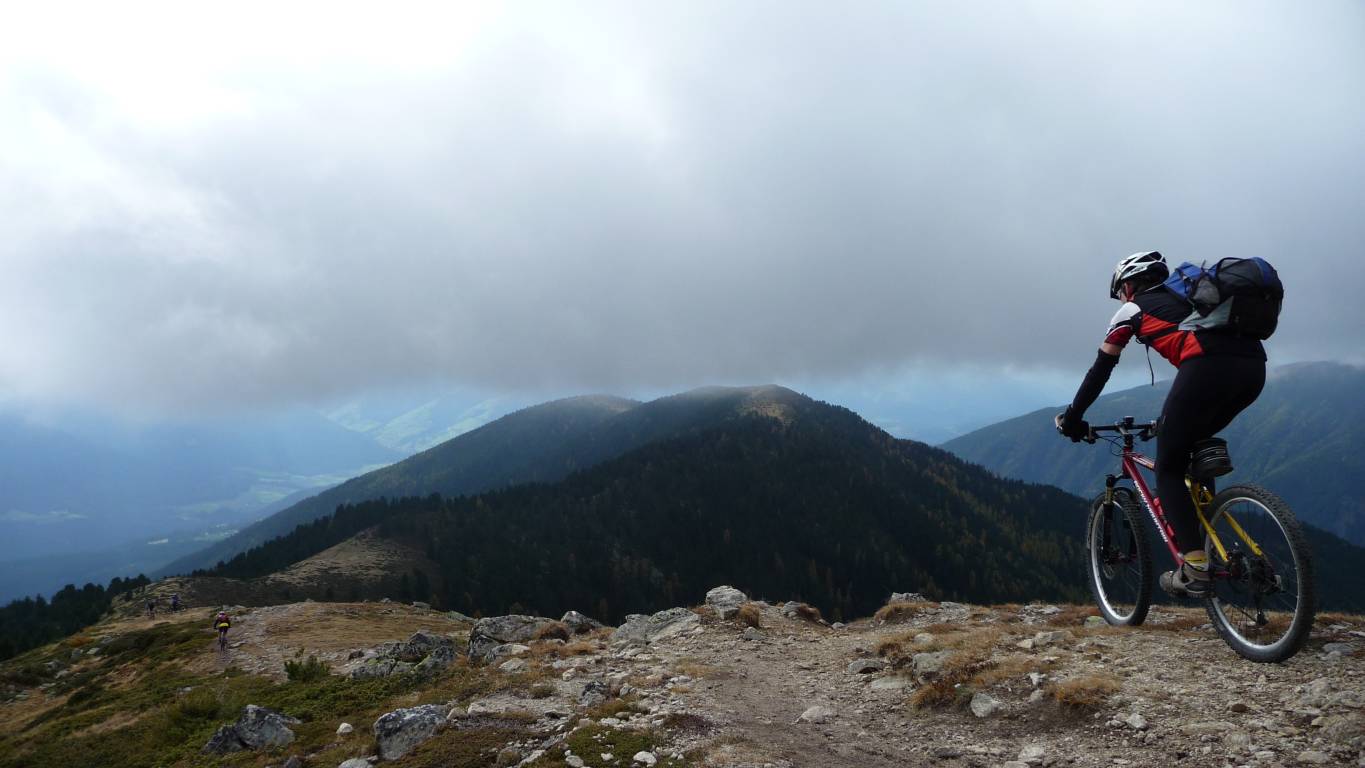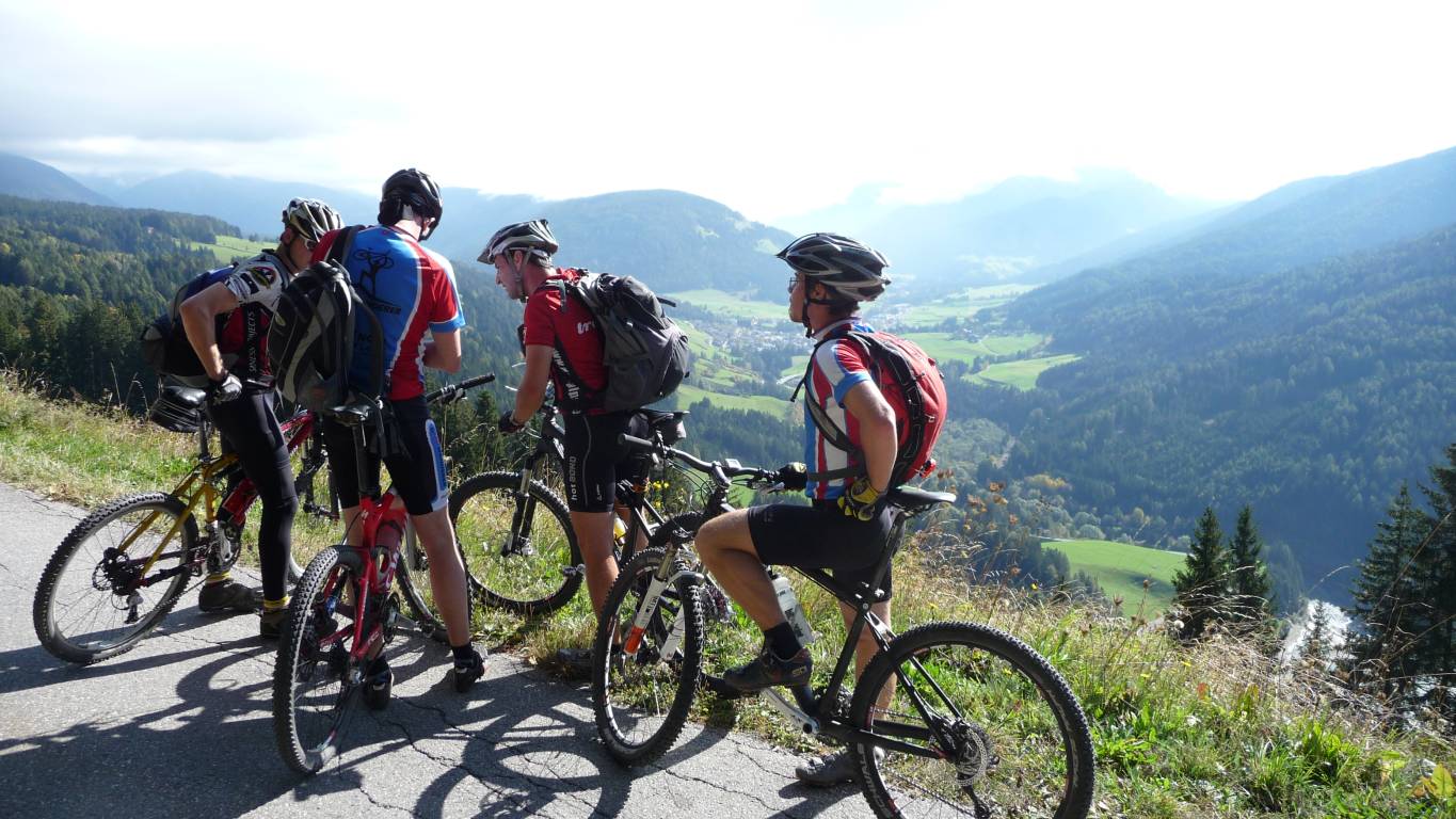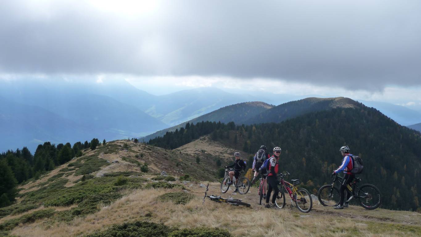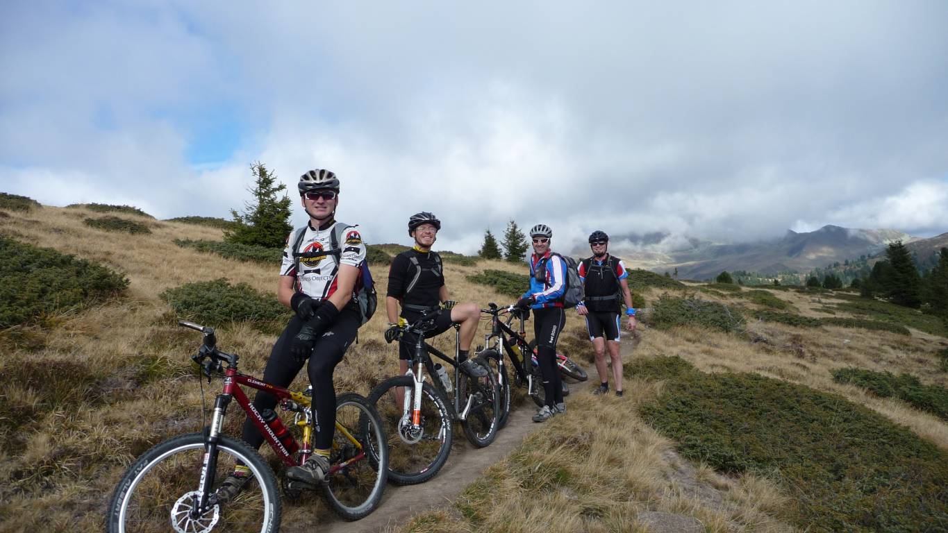 Am Parkplatz zur Taistner Alm angekommen gab es einen kurzen Kriegsrat, da für die Heimfahrt 2 unterschiedliche Wege zur Verfügung standen. Aufgrund seines Namens entschieden wir uns für den Lottersteig. Der erste Teil der Steigs war auch so, wie man sich einen Steig vorstellt: Spassig zu fahren, ohne große Schwierigkeit, aber trotzdem sollte man bei der Sache bleiben. Hier kam auch die Stelle, an der der Ladi zum ersten Mal an diesem Wochenende (er sollte es am zweiten Tag wiederholen) die Wiederverschließbarkeit seiner Tubeless-Reifen testete: nach einer etwas harten Landung am Vorderreifen entwich diesem für einen Moment gut hörbar Luft, aber der Reifen war dann gleich wieder dicht. Die zweite Hälfte des Lottersteigs war dann leider nur mehr ein Forstweg und insofern auch nicht mehr ganz so spannend zu fahren. Trotzdem haben wir auch hier etwas gelernt: verschreckte Kälber sind in der Lage über einen elektrischen Zaun zu springen (es waren sehr schreckhafte Kälber, denn wir haben uns diesen wirklich sehr langsam genähert).