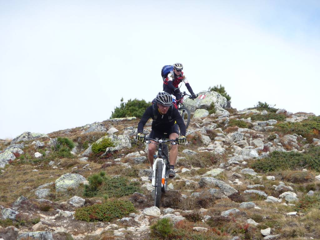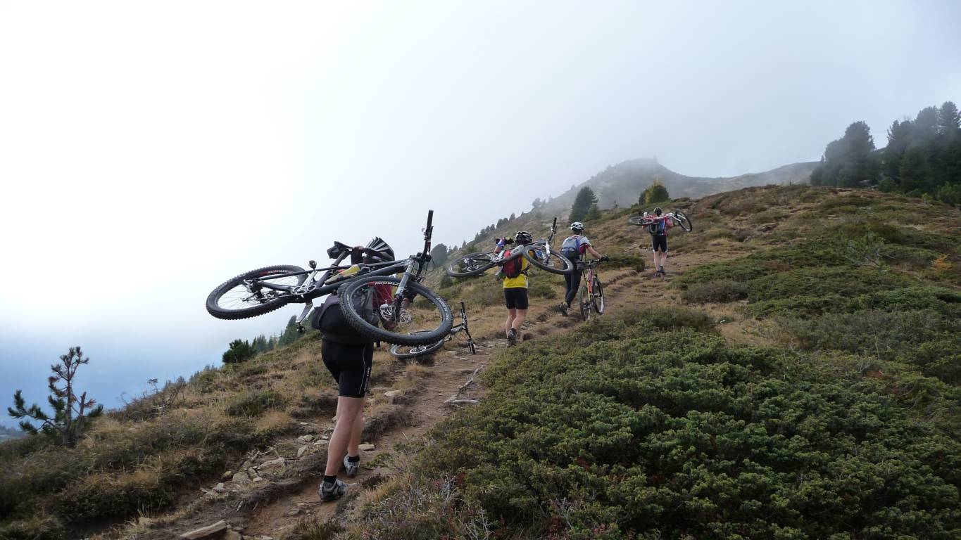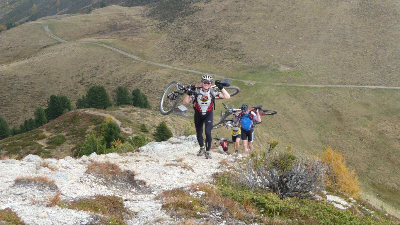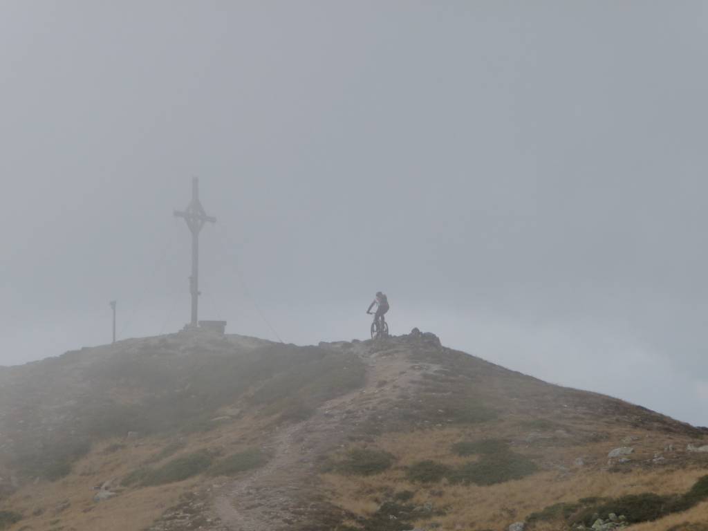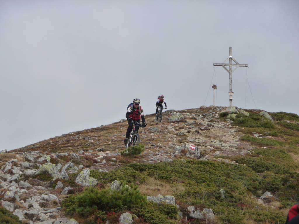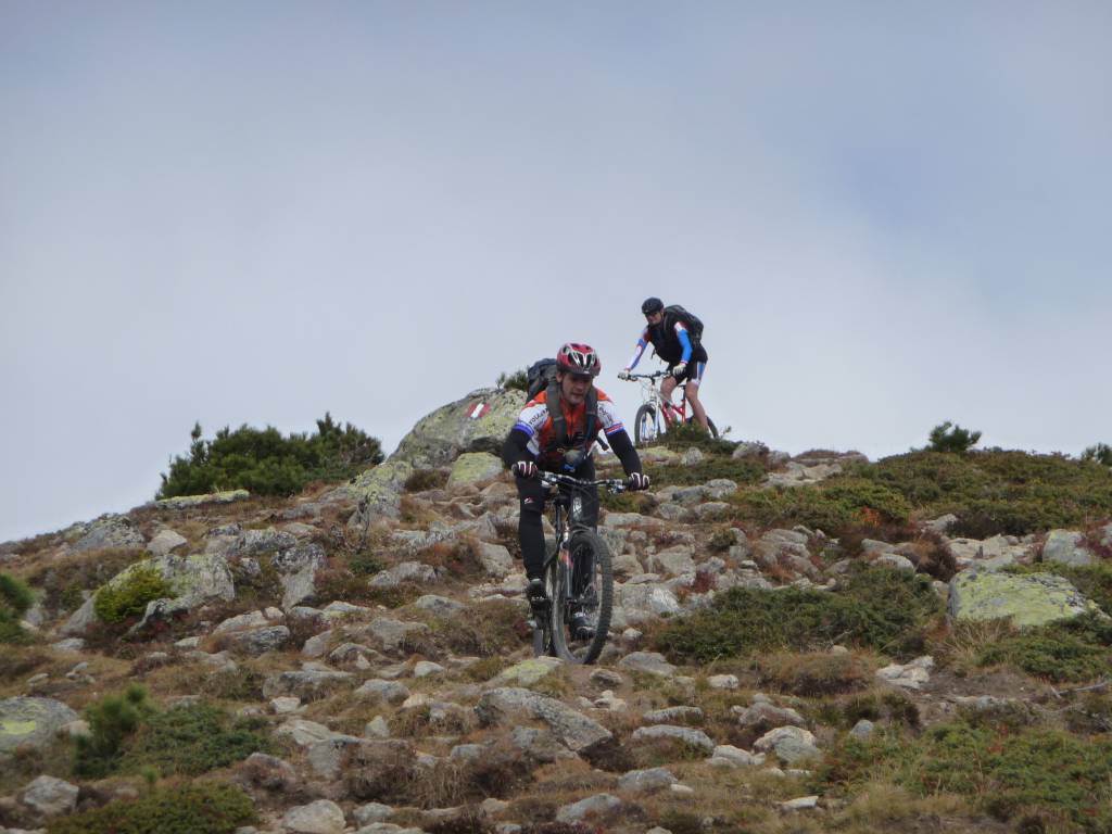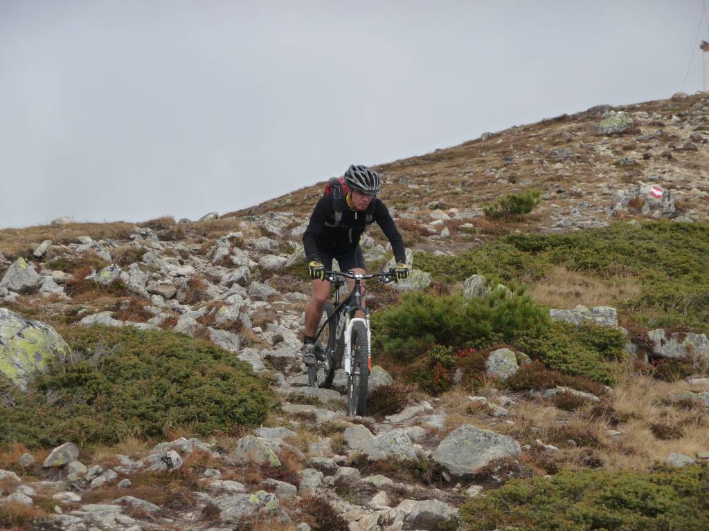 TragepassageDer Gang ins Freie nach der Mittagspause war dann ein kleiner Schock: 6° Celsius erwarteten uns! Trotzdem mussten wir nicht lange frieren, denn nach der Hütte begann er steilste Anstieg des Tages und so war uns innerhalb weniger Minuten wieder warm. Nach kurzer Fahrt erreichten wir dann die erwartete Tragepassage. Wir hatten das Bike noch keine 10 Minuten auf der Schulter als wir dann unseren ersten Gipfel des Tages erreicht hatten: den Durakopf.