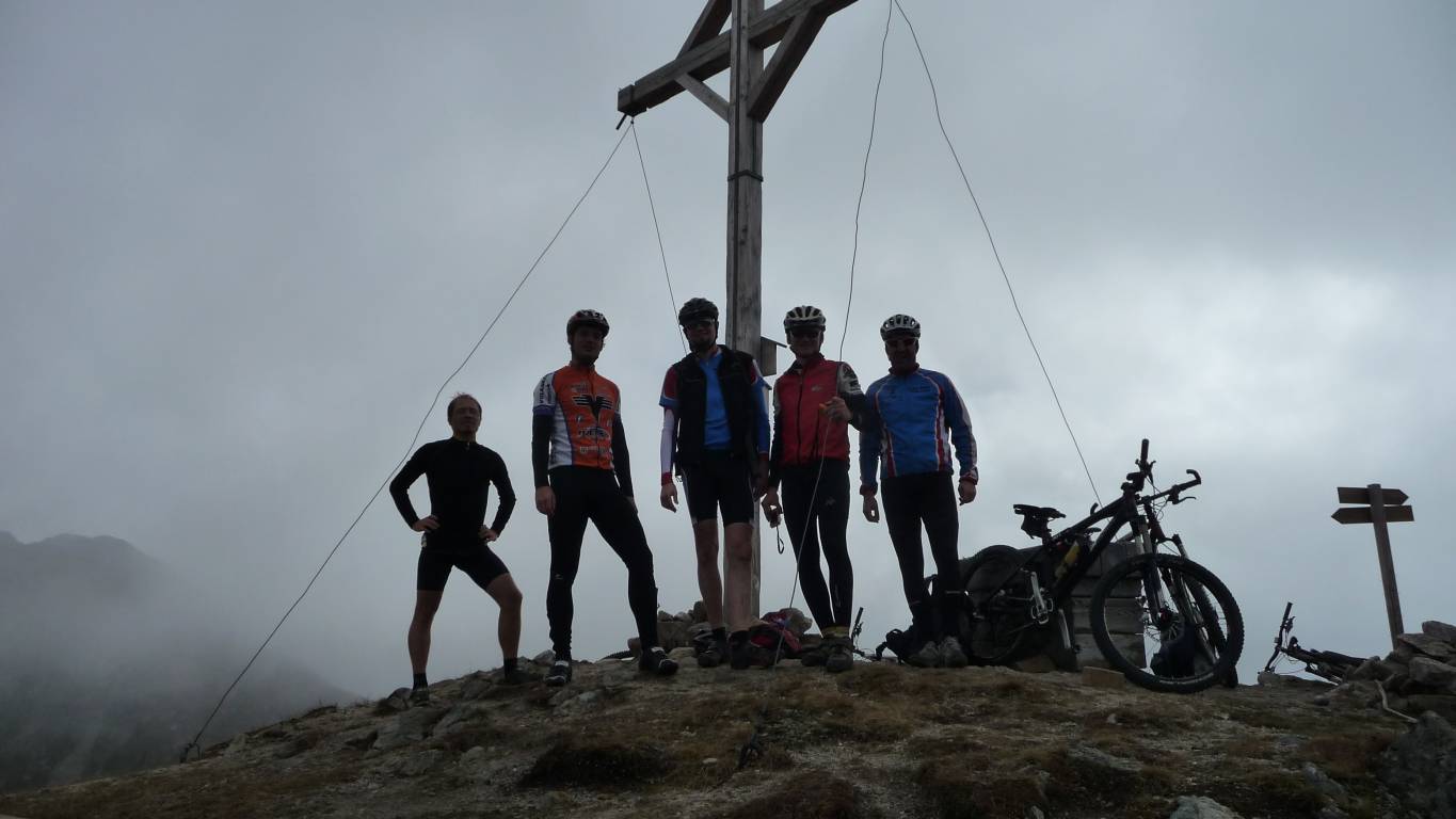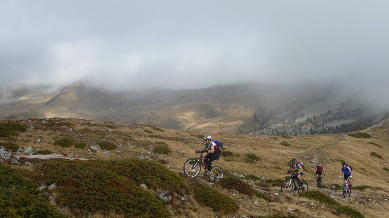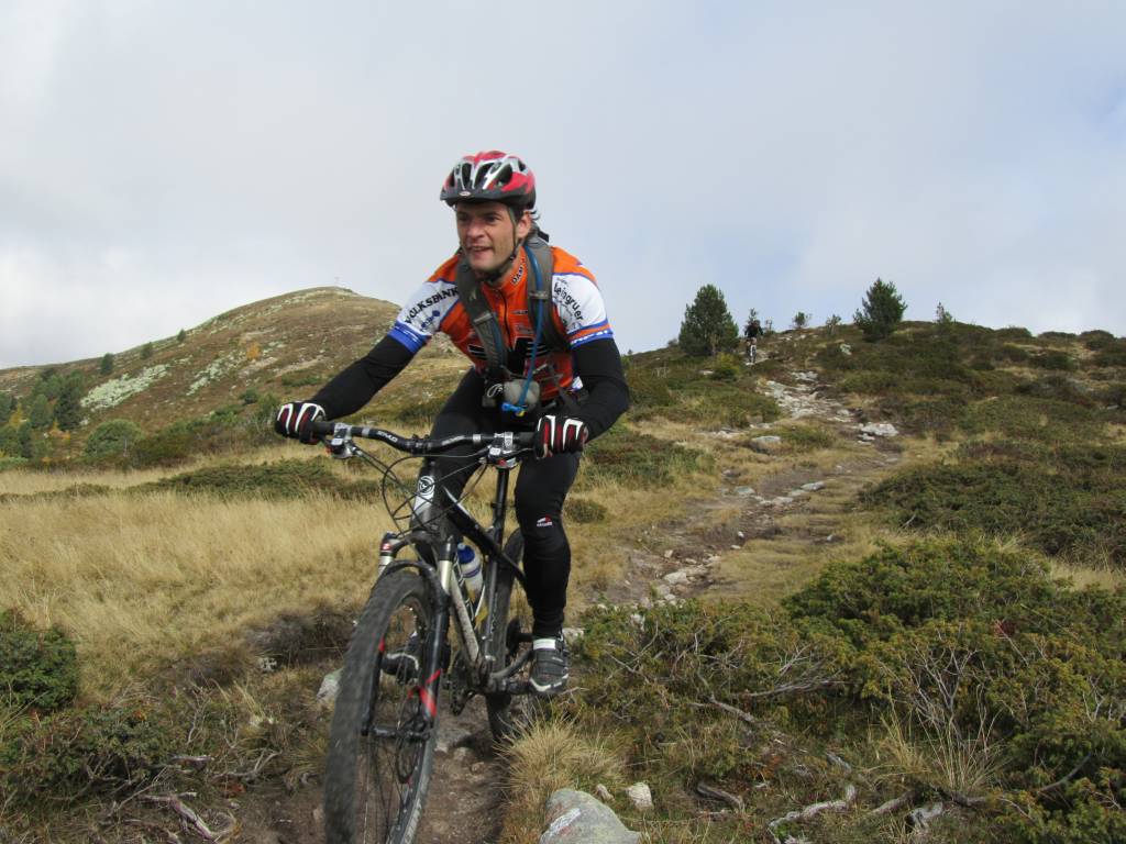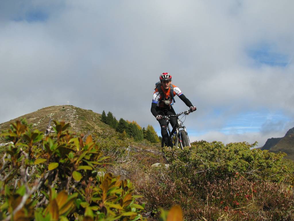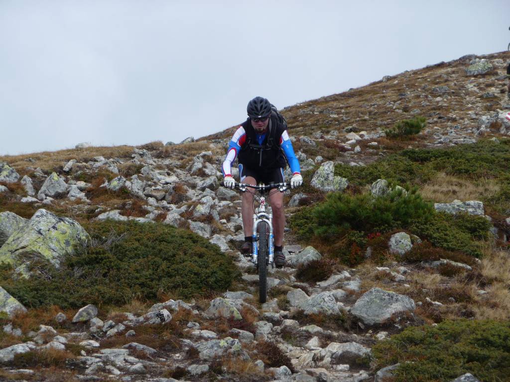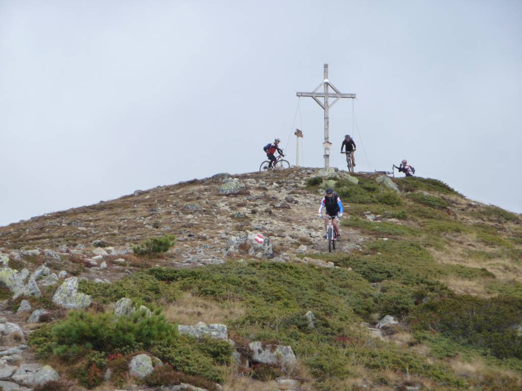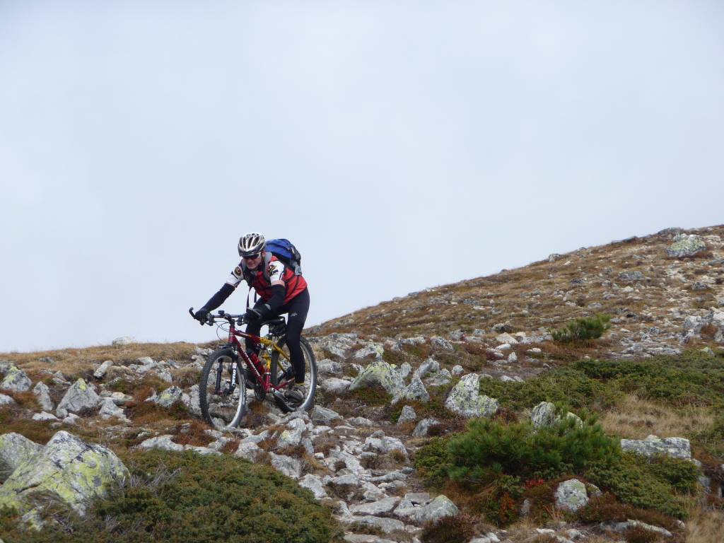 TragepassageDer Gang ins Freie nach der Mittagspause war dann ein kleiner Schock: 6° Celsius erwarteten uns! Trotzdem mussten wir nicht lange frieren, denn nach der Hütte begann er steilste Anstieg des Tages und so war uns innerhalb weniger Minuten wieder warm. Nach kurzer Fahrt erreichten wir dann die erwartete Tragepassage. Wir hatten das Bike noch keine 10 Minuten auf der Schulter als wir dann unseren ersten Gipfel des Tages erreicht hatten: den Durakopf.