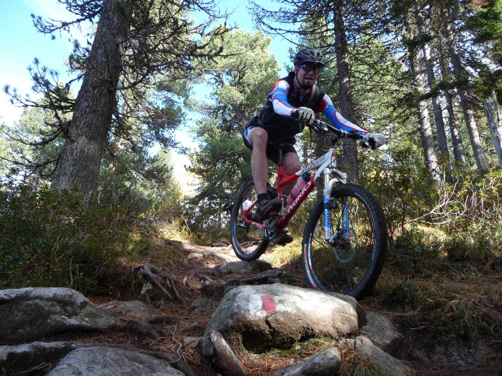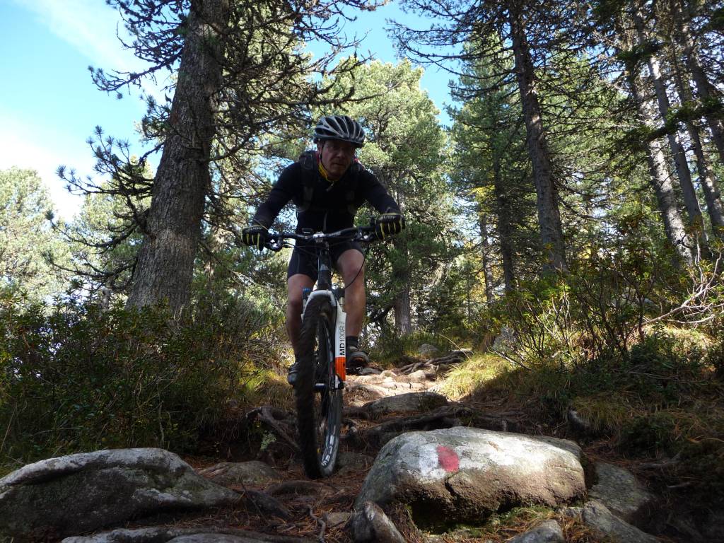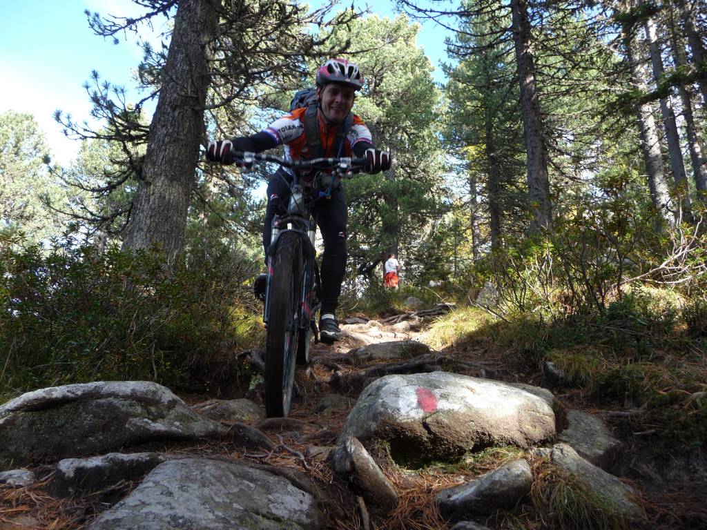 Nach dem zweiten Gipfelfoto des Tages ging es dann wirklich ans Eingemachte, denn nun galt es, Höhenmeter zu vernichten. Nach einem flowigen Stück noch oberhalb der Baumgrenze hat der Weg beim Einstieg in den Wald seinen Charakter komplett geändert. Nix mehr mit flowig. Plötzlich war Fahrtechnik gefragt, vor allem bei den teilweise noch feuchten Wurzeln. Aber auch hier war so gut wie alles fahrbar.