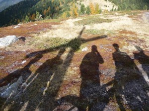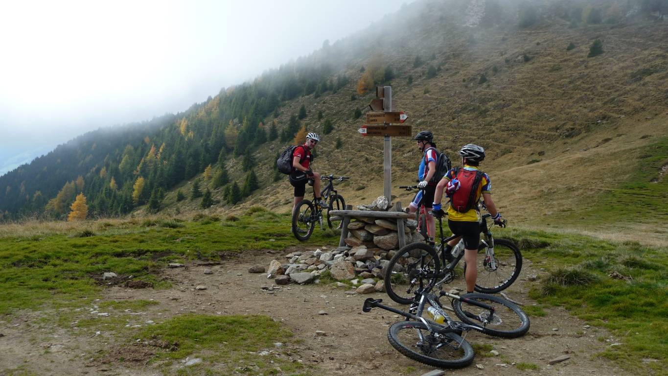 LagebesprechungNach dem Beziehen der Zimmer und einem gemütlichen zweiten Frühstück beim Markushof ging es dann um 11 Uhr los in Richtung Neue Taistner Sennhütte. Der Anstieg war recht gemütlich, aber etwas kühl, da sich die Sonne noch immer hinter dem Hochnebel versteckte.