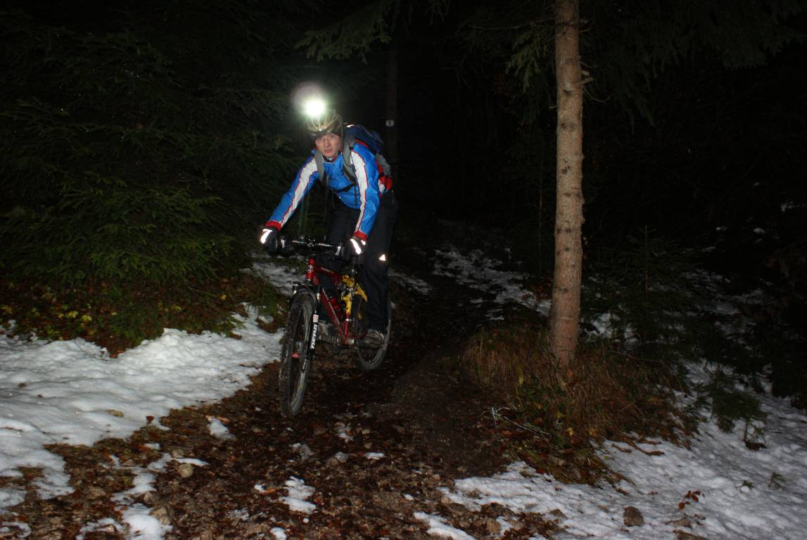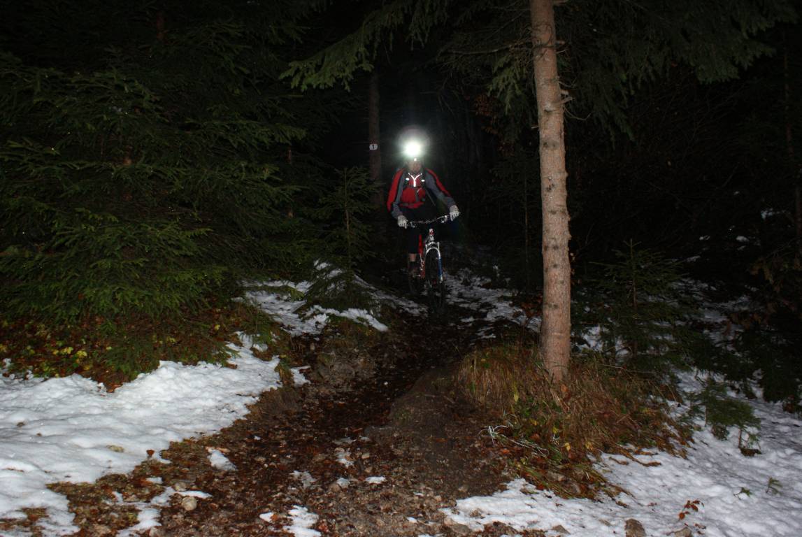 Dann kam aber der Dienstag und allen Vorhersagen zum Trotz war schon in der Früh blauer Himmel zu sehen. Zu diesem blauen Himmel gesellte sich dann um 14:00 Uhr ein SMS vom Christoph mit dem Text „Hat wer Lust auf ein Nachtfahrtl heut?“. Ich musste nicht lange überlegen, das Wetter – mal abgesehen von den eher kühlen Temperaturen – war zu gut um nicht biken zu gehen. Und so kam es, dass um 18:30 Uhr 2 verwegene Biker von der Rotunde aus in Richtung Rumer Alm starteten. Markus konnte sich nicht so ganz entscheiden: zuerst wollte er mitkommen, dann doch nicht und schlussendlich hat er sich überreden lassen, auf direktem Weg von der Hungerburg zur Rumer Alm zu kommen.