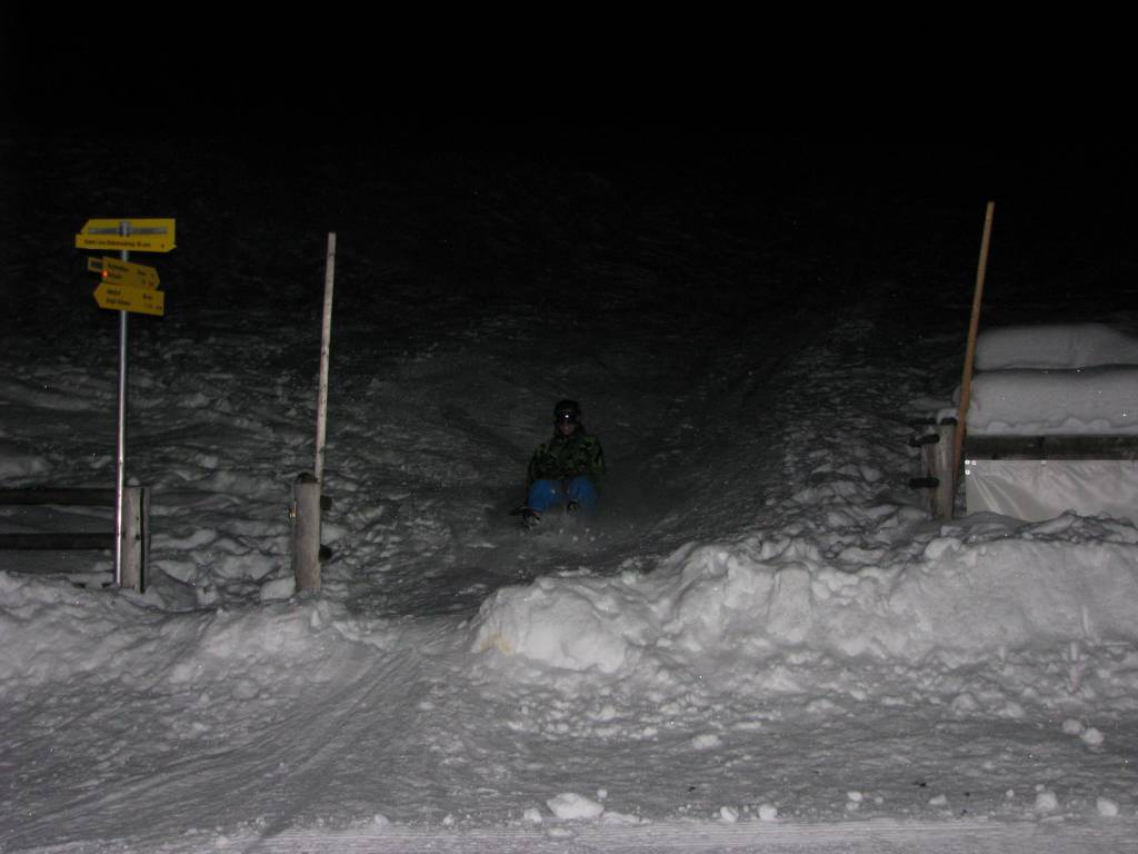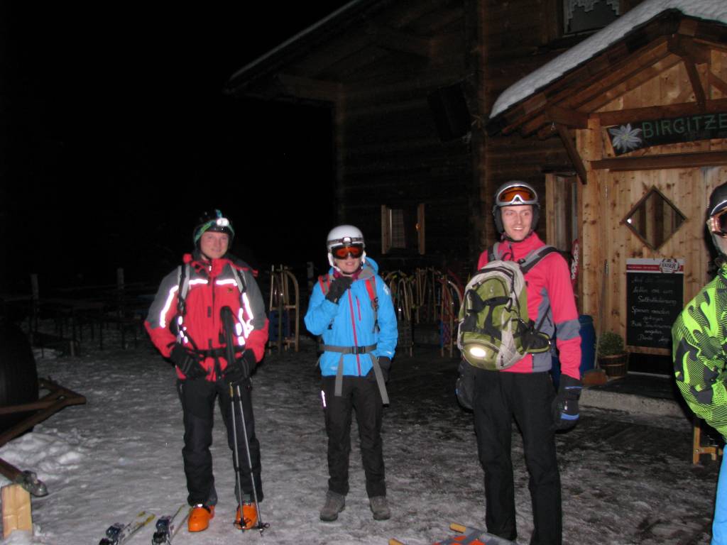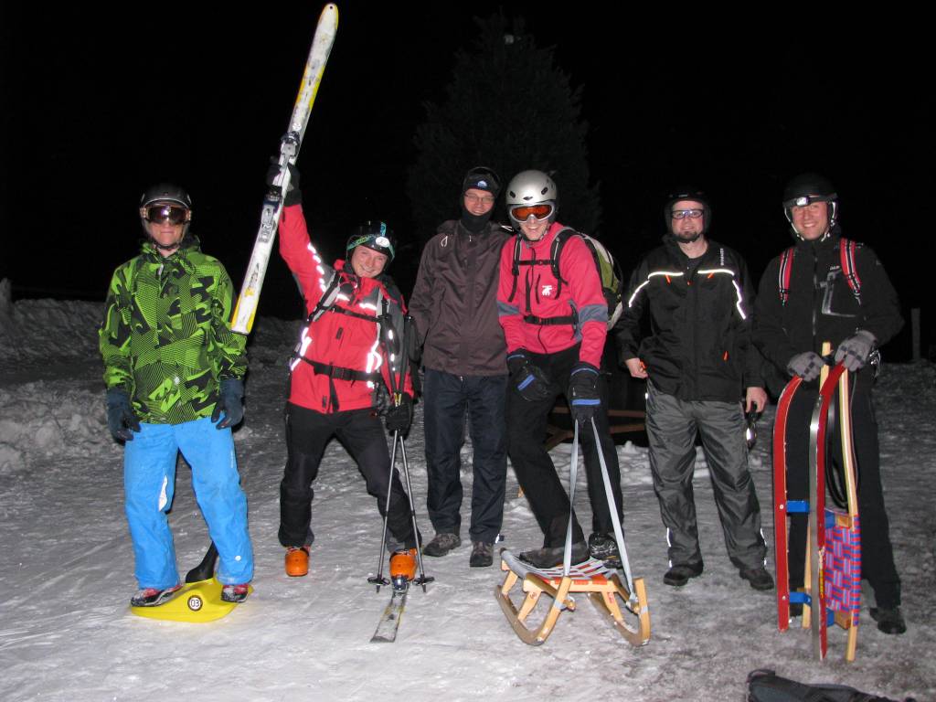 Dementsprechend motiviert trafen sich dann auch 7 Verwegene (Markus, Roland, Tom, Joe, Anna, Christoph und ich) bei der Rodelbahn. Schon am Weg zur Hütte, den wir in knapp 50 Minuten zurücklegten, zeigte sich, dass die Bahn zwar weich, aber sonst in einem Top-Zustand war. Nach einer kurzen, aber sehr guten Stärkung in der Hütte, ging es dann wieder bergab. Christoph auf Tourenskiern (nach einem kurzen Abstecher aufs Birgitzköpfl), Markus auf einem Zipflbob, der Rest klassisch auf der Rodel. Die neue Rodel vom Tom wurde dabei auch gleich gebührend eingeweiht. Alles in allem ein sehr angenehmer Abend. Einzig und allein an der Ausleuchtung der Strecke müssen wir noch arbeiten, denn die war aufgrund vergessener Lampen noch nicht ganz optimal. Markus hat auch festgestellt, dass es sich etwas leichter fährt, wenn man die Strecke sieht. Und die Tatsache, dass vor 2 Tagen Neumond war, hat die Helligkeit der Rodelbahn auch nicht unbedingt erhöht. 🙂