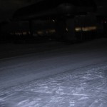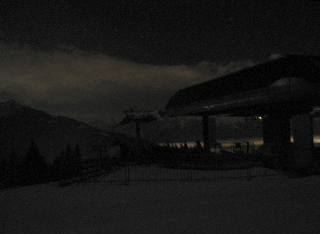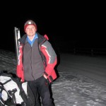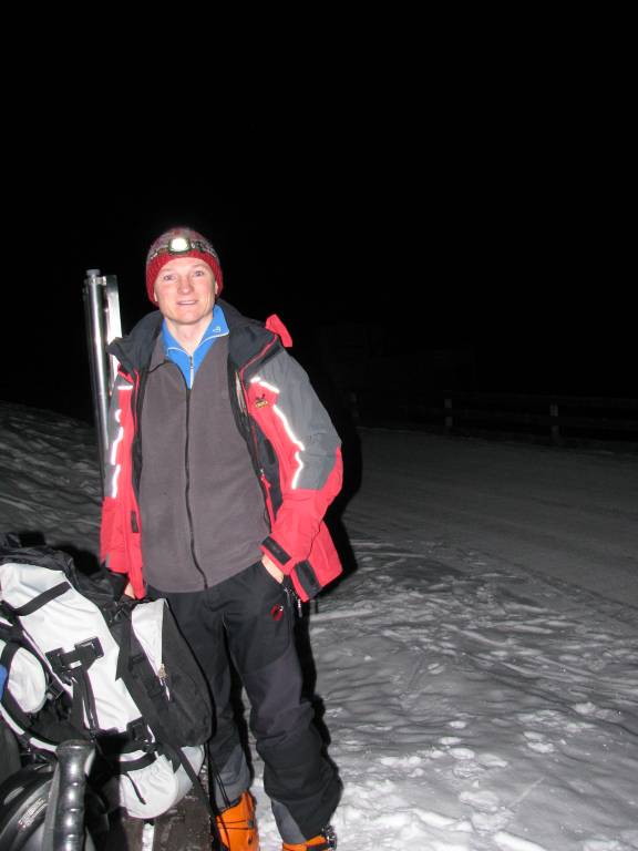 Dichter Nebel lag in Innsbruck als wir uns auf den Weg nach Mieders machten und wir waren skeptisch. Hat der (Kunst)Schnee dem warmen Wetter getrotzt? Wie würde sich die Piste zeigen? Aber als wir endlich mit angeschnallten Skiern auf der Piste standen, erkannten wir gleich, dass unsere Sorgen unbegründet waren: die Bedingungen waren viel besser als erwartet. Während dem mehr (für Christoph) oder weniger (für mich) gemütlichen Aufstieg kamen uns 2 Tourengeher entgegen und kurz darauf noch eine Pistenraupe. Ansonsten hatten wir die frisch präparierte Skipiste für uns allein (abgesehen von noch 4 Tourengehern, die uns dann auf der Abfahrt begegneten). Nach knapp einer Stunde Gehzeit erreichten wir dann unser Ziel und erkannten, dass wir uns wohl im Freien umziehen und auf die Stärkung verzichten müssten. Das hatten wir schon geahnt, denn die Rodelbahn war zwar beleuchtet, aber aufgrund der derzeitigen Schneesituation geschlossen und bei geschlossener Rodelbahn verhält sich der Gasthof solidarisch und öffnet auch nicht.