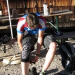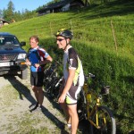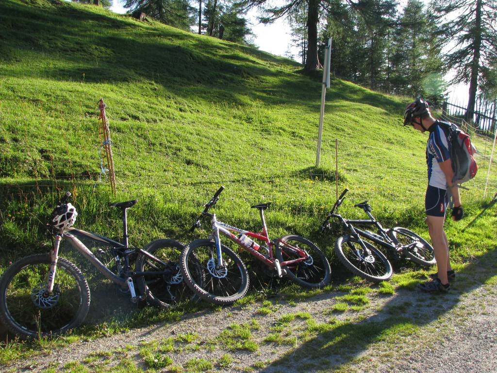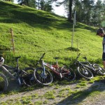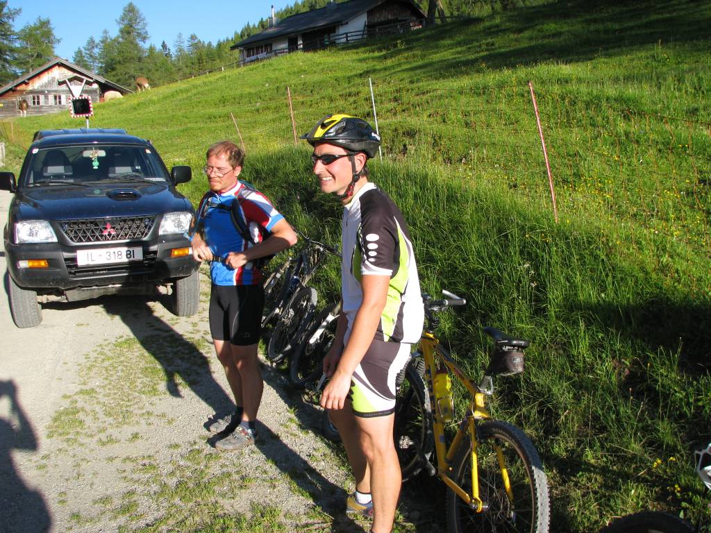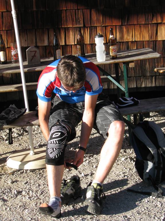 Bei weiterhin bestem Wetter, aber erträglichen 23 Grad Celsius erreichten wir die Hütte, wo als erstes eine Stärkung am Programm stand. Der körpereigene Flüssigkeitshaushalt wollte wieder aufgefüllt werden. Nach einem Getränk und dem obligatorischen Schnaps, den man hier nicht ausweichen kann, machten wir uns dann wieder auf dem Weg zurück ins Tal, zwischenzeitlich gebremst von einem Snakebite bei mir (Thompson), der recht überraschend kam, denn weder hatte ich vor der Abfahrt den Luftdruck im Vorderreifen verringert, noch gab es an der betreffenden Stelle eine Stufe oder irgendwas.