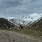 Mit viel Überredungskunst konnte wir Stef davon überzeugen, im Rifugio Mottafoiada (falls es offen sein sollte) zumindest einen Kaffee zu trinken. Kaum drinnen in der warmen Stube, kam jedoch genau von Stef die Frage, ob wir nicht eventuell doch gleich noch einen Teller Spaghetti essen sollten. Es blieb allerdings beim Kaffee und dann gings weiter in Richtung Passhöhe. Wenige Meter unterhalb des Rifugio Il Giovo, in einer etwas windgeschützen Kurve wurde dann die Mittagspause eingeläutet. Recht lang – überraschend lang – mussten wir da auf Christoph Schmiedauer, Martin und Susi warten, aber wie sich herausstellen sollte, wollte der Tubeless-Hinterreifen von Christoph nicht mehr dicht bleiben und liess sich erst durch die Zugabe eines Schlauch wieder dazu überreden die zugeführte Luft auch zu behalten (und Christoph erfuhr gleichzeitig, dass sein Reifen keine Dichtmilch enthalten hatte).