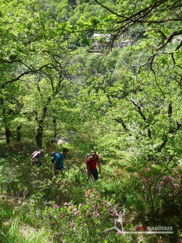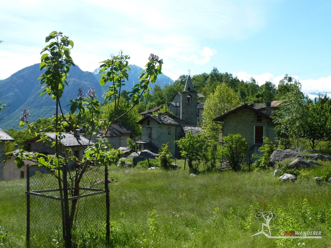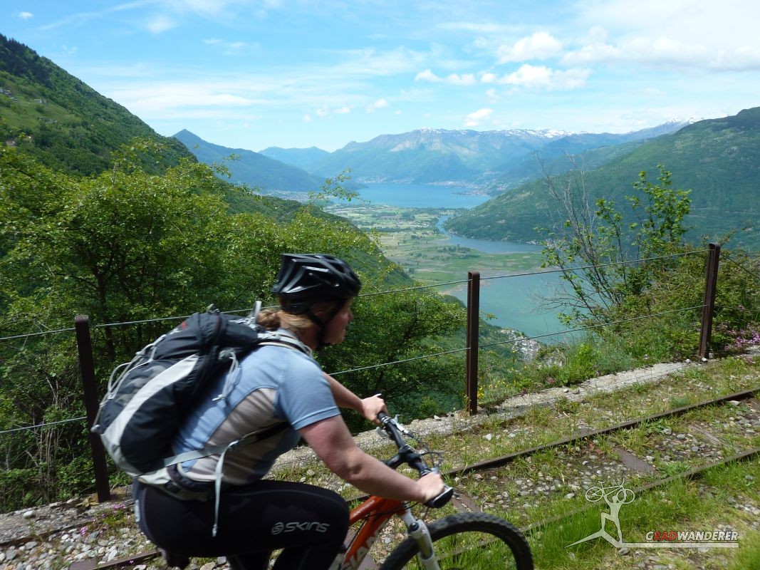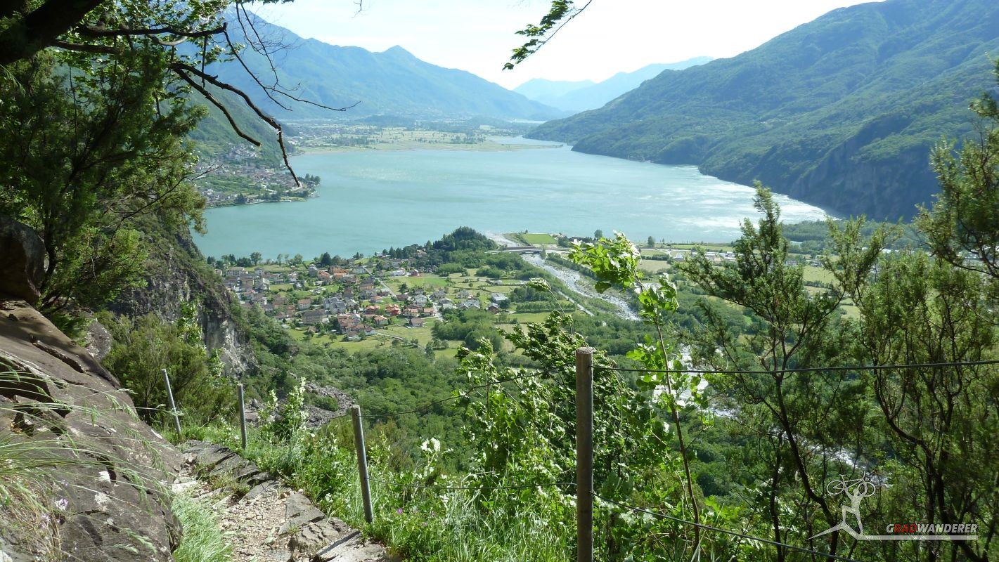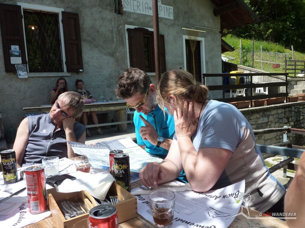 Unsere Tourenbeschreibung hatte uns empfohlen, den Abstieg (und auf der gegenüberliegenden Talseite den Anstieg) nach Codera ohne Fahrräder in Angriff zu nehmen, also versteckten wir diese im Gebüsch. Mit Codera erwartete uns ein kleines, nur zu Fuß oder per Materialseilbahn erreichbares Dorf. Seine Blütezeit hat es schon längst hinter sich und von den bis zu 600 Einwohnern, die zeitweise dort wohnten, leben jetzt nur mehr etwa 2 Handvoll Menschen ganzjährig dort. Das Rifugio Osteria Alpina, das wir in Codera dann vorfanden (wie sich später herausstellen sollte, gibt es in Codera 2 Lokale) war dann das Gegenteil von dem, was wir aufgrund der vorherigen Beschreibung erwartet hatten: die Bewirtung war zuvorkommend und sehr freundlich und wir konnten weder an Essen noch an Trinken einen Grund zur Klage finden. Wir wurde wieder mit einem Teller Nudeln und diesmal sogar 2 Kuchen (der zweite, eine Art Kletzenbrot ging aufs Haus) und viel Sonne verwöhnt so dass wir ganz darauf vergaßen, die Uhr genauer im Auge zu behalten. So war es dann schon der späte Nachmittag, als wir endlich beschlossen, uns wieder auf den Weg zu machen. Bei den Fahrrädern angekommen, gab es auch noch eine spontane Routenänderung. Der ursprüngliche Plan hätte uns wieder den ganzen Weg am Tracciolino zurück geführt und dann immer wieder den Auffahrtsweg kreuzend mit Abkürzern zurück ins Tal. Dieser war uns schon bei der Anfahrt aufgefallen und schien nicht besonders einfach zu sein (steil und recht stufig).