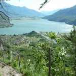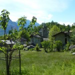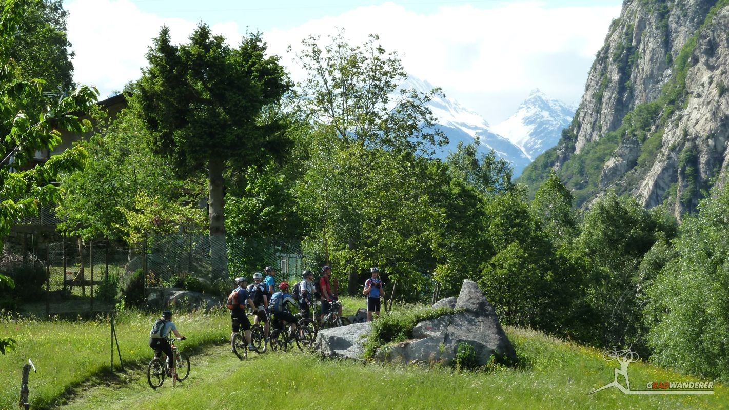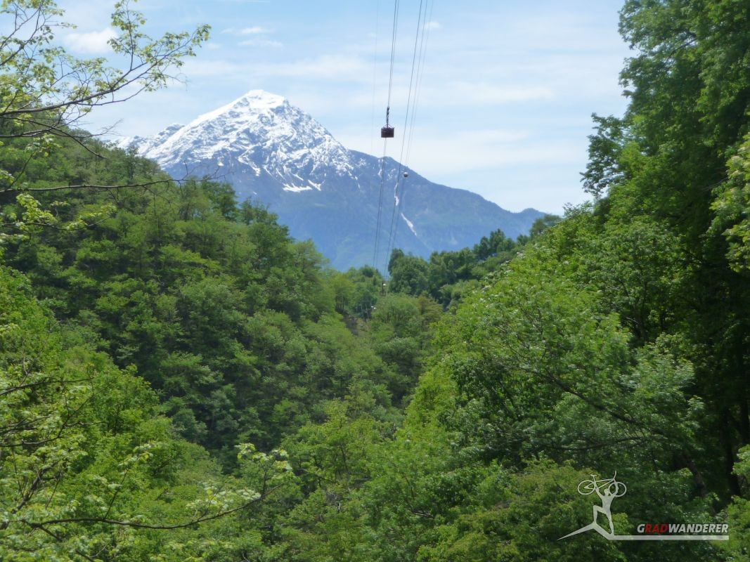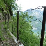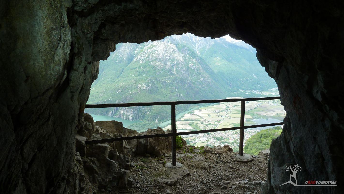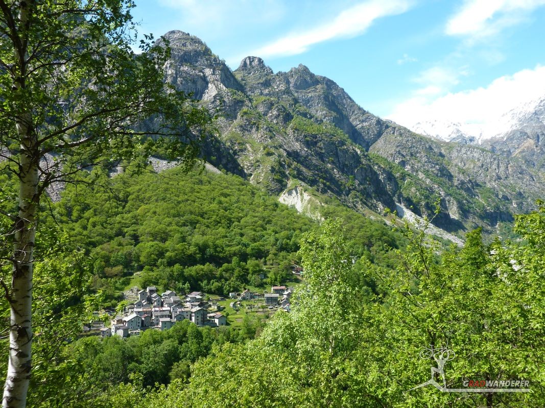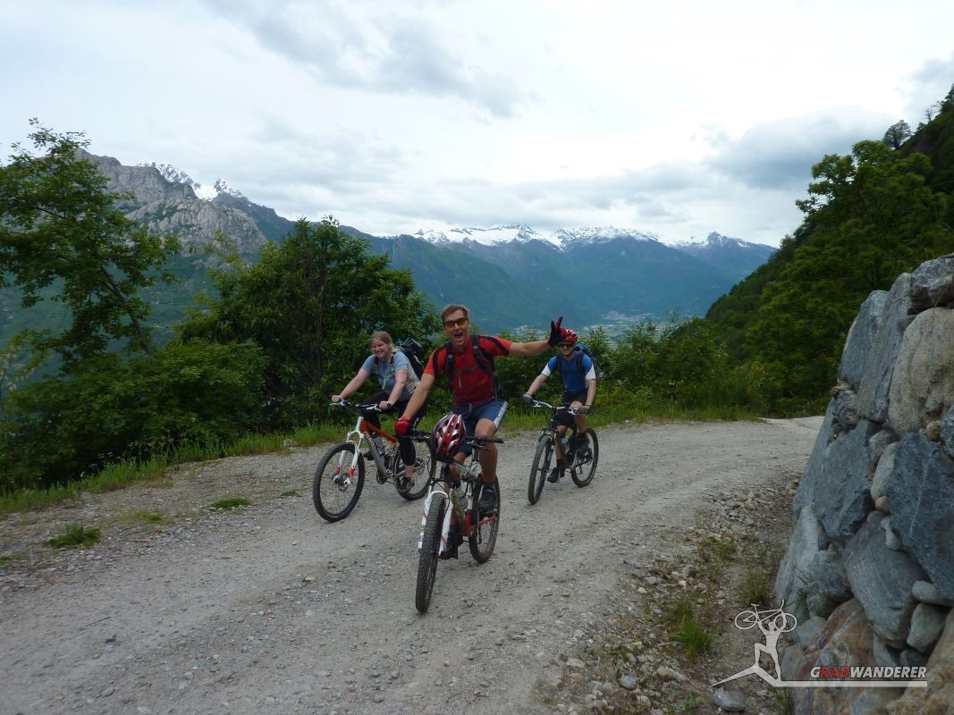 Unsere Tourenbeschreibung hatte uns empfohlen, den Abstieg (und auf der gegenüberliegenden Talseite den Anstieg) nach Codera ohne Fahrräder in Angriff zu nehmen, also versteckten wir diese im Gebüsch. Mit Codera erwartete uns ein kleines, nur zu Fuß oder per Materialseilbahn erreichbares Dorf. Seine Blütezeit hat es schon längst hinter sich und von den bis zu 600 Einwohnern, die zeitweise dort wohnten, leben jetzt nur mehr etwa 2 Handvoll Menschen ganzjährig dort. Das Rifugio Osteria Alpina, das wir in Codera dann vorfanden (wie sich später herausstellen sollte, gibt es in Codera 2 Lokale) war dann das Gegenteil von dem, was wir aufgrund der vorherigen Beschreibung erwartet hatten: die Bewirtung war zuvorkommend und sehr freundlich und wir konnten weder an Essen noch an Trinken einen Grund zur Klage finden. Wir wurde wieder mit einem Teller Nudeln und diesmal sogar 2 Kuchen (der zweite, eine Art Kletzenbrot ging aufs Haus) und viel Sonne verwöhnt so dass wir ganz darauf vergaßen, die Uhr genauer im Auge zu behalten. So war es dann schon der späte Nachmittag, als wir endlich beschlossen, uns wieder auf den Weg zu machen. Bei den Fahrrädern angekommen, gab es auch noch eine spontane Routenänderung. Der ursprüngliche Plan hätte uns wieder den ganzen Weg am Tracciolino zurück geführt und dann immer wieder den Auffahrtsweg kreuzend mit Abkürzern zurück ins Tal. Dieser war uns schon bei der Anfahrt aufgefallen und schien nicht besonders einfach zu sein (steil und recht stufig).