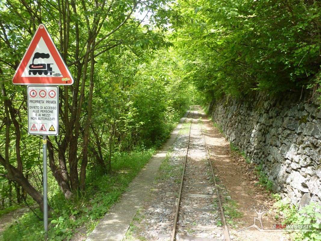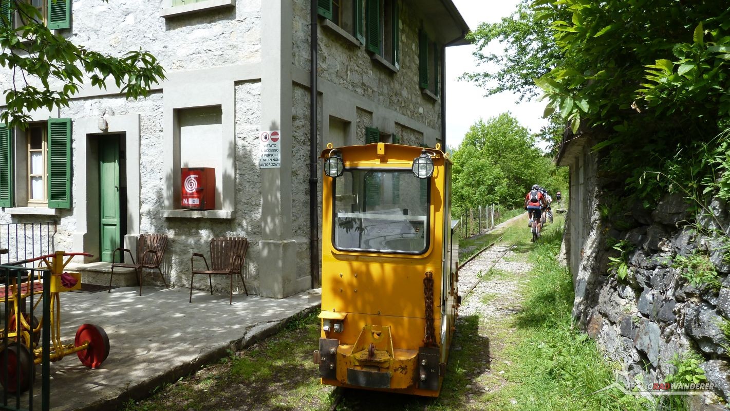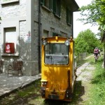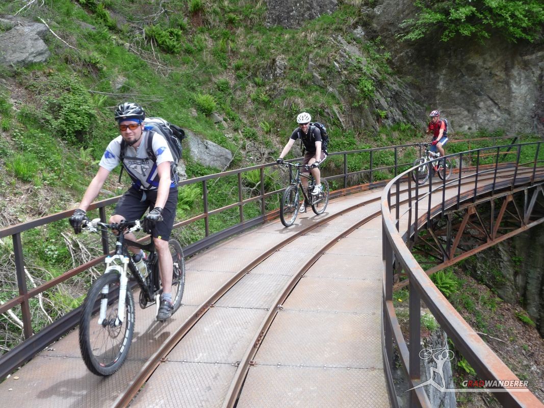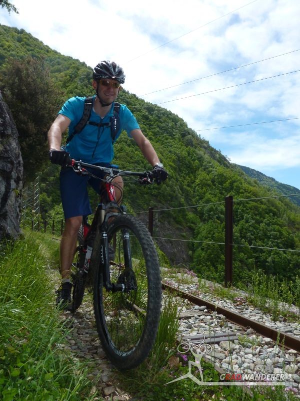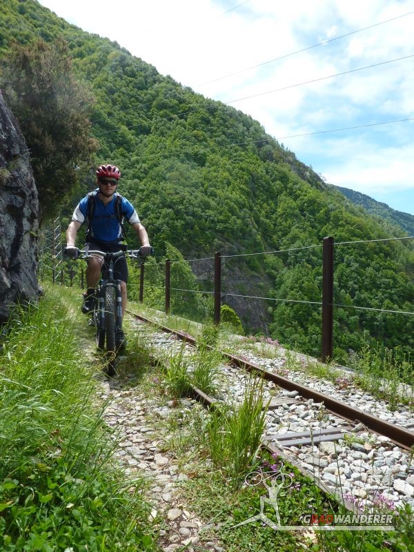 Der Aufstieg (knapp 700hm) war wie erwartet: zuerst ein Fahrweg, der dann irgendwann in einen Forstweg überging und schon bald hatten wir die Höhe hinter uns gebracht und die Gleise vor uns. Von nun an sollte es (mehr oder weniger) flach dahingehen. Nach einer kurzen Stärkung folgten wir nun den Gleisen der sich noch immer in Betrieb befindlichen Kontrollbahn des lokale E-Werks. Diesem Weg folgten wir nun, nur kurz aufgehalten durch ein Gespräch mit einem sehr stylisch gekleideten „Local“, der gerade fertig wurde, seine Kette zu reparieren. Dieser bot uns dann auch gleich an, uns den Weg nach Codera zu zeigen (den wir ansonsten anhand der Karte auf gefunden hätten). Später wurde aus dem Weg mit Gleisen nur mehr ein Weg, der eine gewisse Ähnlichkeit mit der Val d’Unia aufweist, allerdings mit dem Unterschied, dass der Weg hier befahrbar ist. Zwar wurde uns von oben erwähnten Einheimischen davon abgeraten, Codera (oder zumindest den Gasthof dort) zu besuchen, da er schlechte Erfahrungen mit dem dortigen Wirt gemacht hätte, aber davon ließen wir uns nicht beeinflussen.