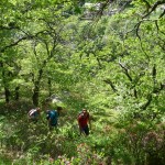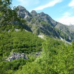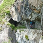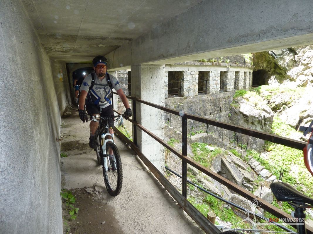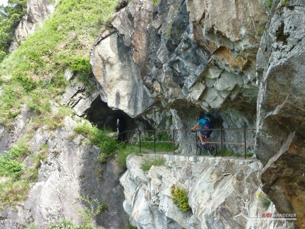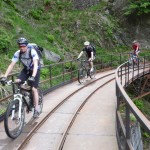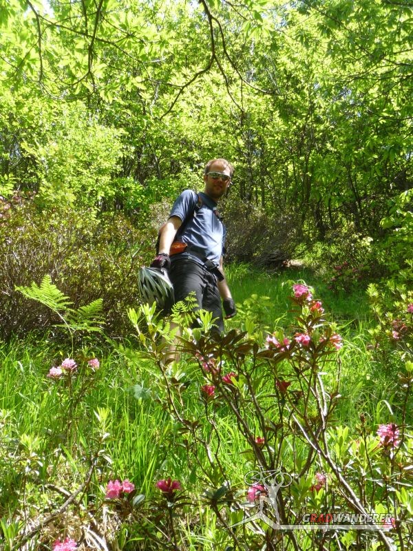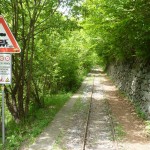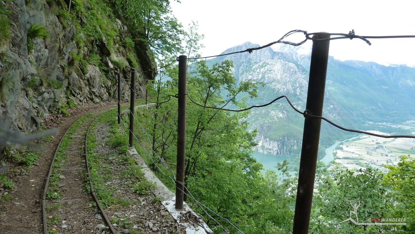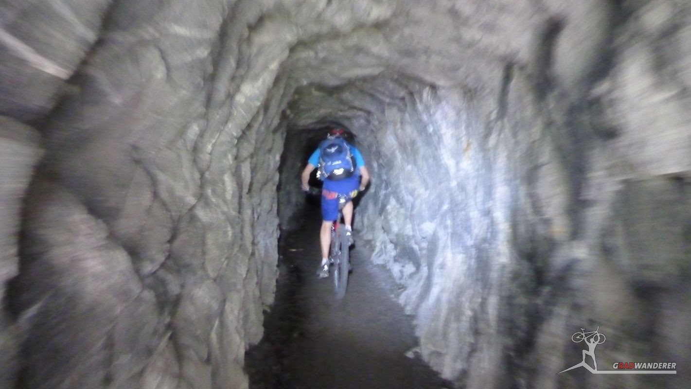 Der Aufstieg (knapp 700hm) war wie erwartet: zuerst ein Fahrweg, der dann irgendwann in einen Forstweg überging und schon bald hatten wir die Höhe hinter uns gebracht und die Gleise vor uns. Von nun an sollte es (mehr oder weniger) flach dahingehen. Nach einer kurzen Stärkung folgten wir nun den Gleisen der sich noch immer in Betrieb befindlichen Kontrollbahn des lokale E-Werks. Diesem Weg folgten wir nun, nur kurz aufgehalten durch ein Gespräch mit einem sehr stylisch gekleideten „Local“, der gerade fertig wurde, seine Kette zu reparieren. Dieser bot uns dann auch gleich an, uns den Weg nach Codera zu zeigen (den wir ansonsten anhand der Karte auf gefunden hätten). Später wurde aus dem Weg mit Gleisen nur mehr ein Weg, der eine gewisse Ähnlichkeit mit der Val d’Unia aufweist, allerdings mit dem Unterschied, dass der Weg hier befahrbar ist. Zwar wurde uns von oben erwähnten Einheimischen davon abgeraten, Codera (oder zumindest den Gasthof dort) zu besuchen, da er schlechte Erfahrungen mit dem dortigen Wirt gemacht hätte, aber davon ließen wir uns nicht beeinflussen.
