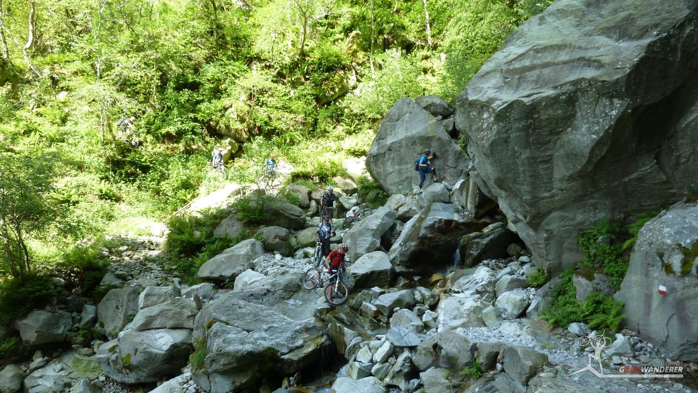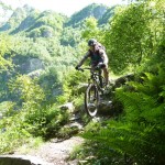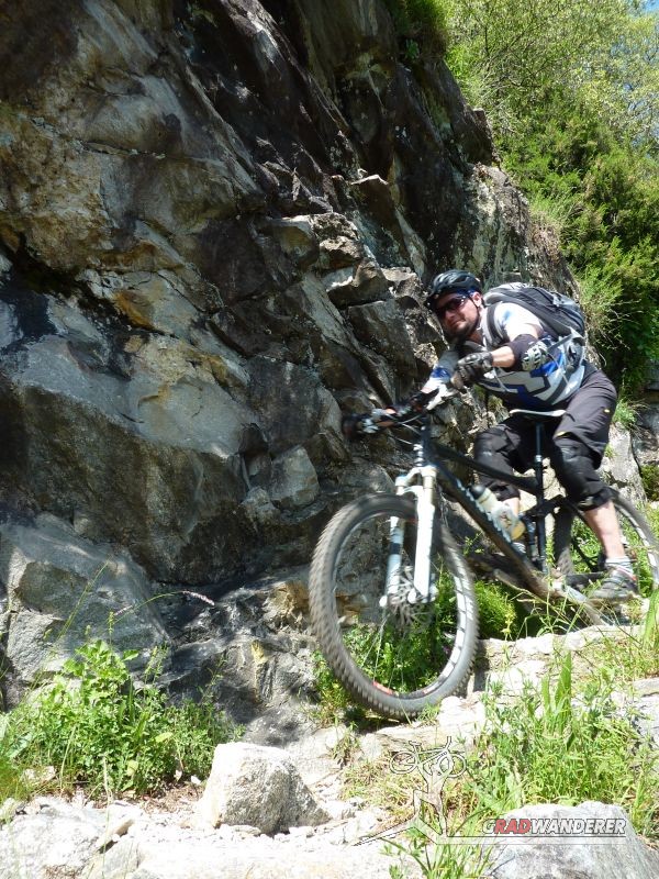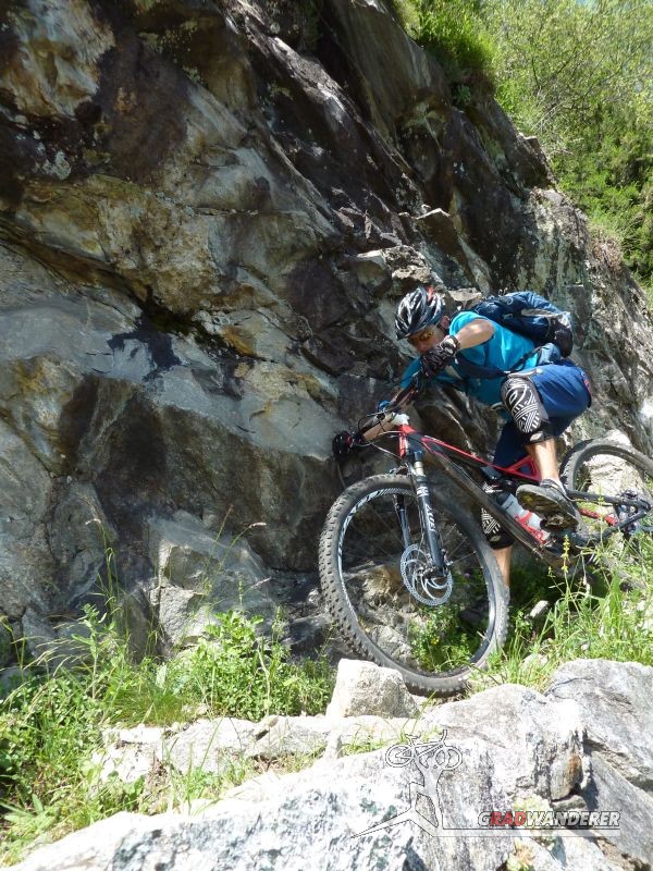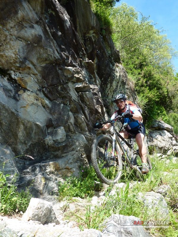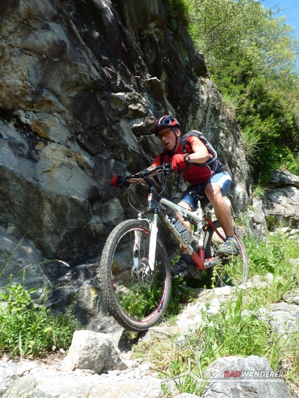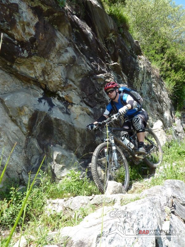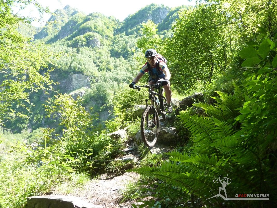 Der neue Plan ließ uns schon eine der ersten Abzweigungen am Tracciolino nehmen und San Giorgio war unser nächstes Ziel. Anfangs war der Weg noch recht einfach, bald schon aber zeigte er sich mehr und mehr von seiner verblockten Seite, so dass wir kurzfristig sogar daran zweifelten, die richtige Wahl getroffen zu haben. Nach einiger Zeit, die wir fahrend, schiebend und auch tragend zurückgelegt hatten, gelangten wir dann endlich nach San Giorgio, einem malerischen Ort, der sogar noch abgelegener ist als dies Codera schon war (hier gibt es nämlich nicht mal eine Materialseilbahn). Ab hier jedoch wussten wir, dass sich die Planänderung mehr als ausgezahlt hatte. In unzähligen Kehren ging es dann am Steilhang entlang in Richtung Tal. Bremsen und auch Federgabeln wurden noch einmal richtig strapaziert.