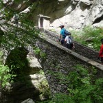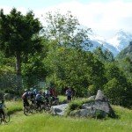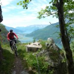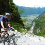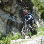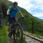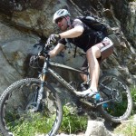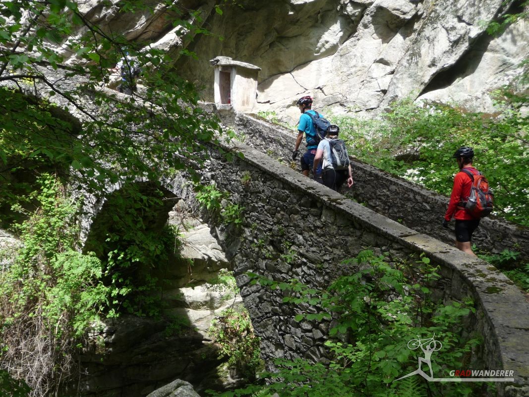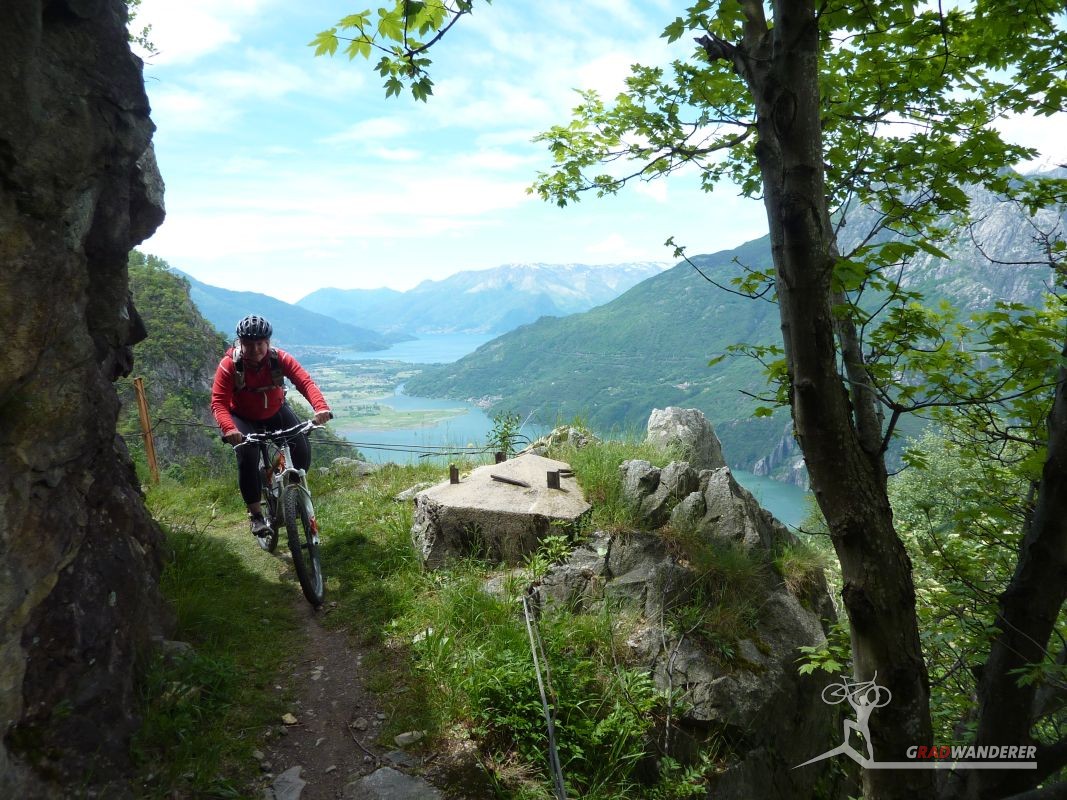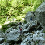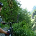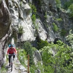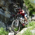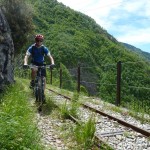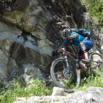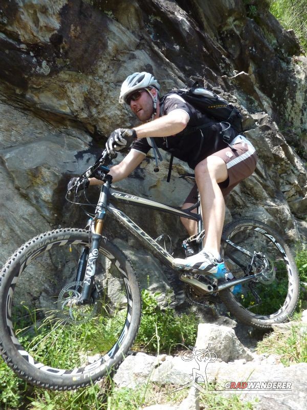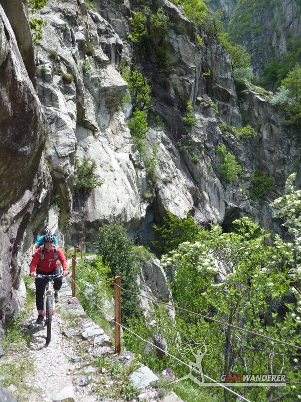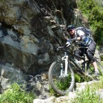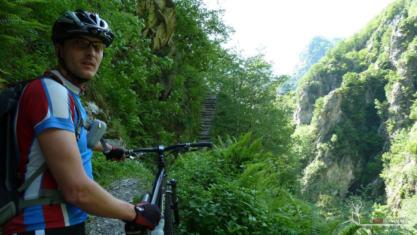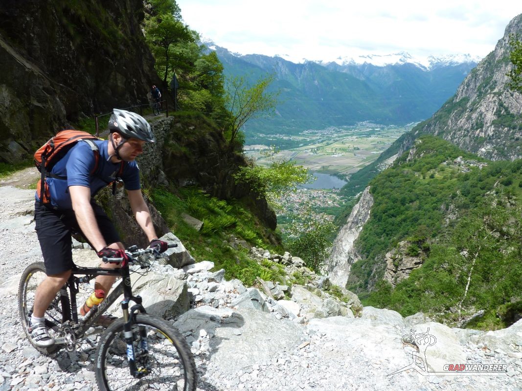 Der neue Plan ließ uns schon eine der ersten Abzweigungen am Tracciolino nehmen und San Giorgio war unser nächstes Ziel. Anfangs war der Weg noch recht einfach, bald schon aber zeigte er sich mehr und mehr von seiner verblockten Seite, so dass wir kurzfristig sogar daran zweifelten, die richtige Wahl getroffen zu haben. Nach einiger Zeit, die wir fahrend, schiebend und auch tragend zurückgelegt hatten, gelangten wir dann endlich nach San Giorgio, einem malerischen Ort, der sogar noch abgelegener ist als dies Codera schon war (hier gibt es nämlich nicht mal eine Materialseilbahn). Ab hier jedoch wussten wir, dass sich die Planänderung mehr als ausgezahlt hatte. In unzähligen Kehren ging es dann am Steilhang entlang in Richtung Tal. Bremsen und auch Federgabeln wurden noch einmal richtig strapaziert.
