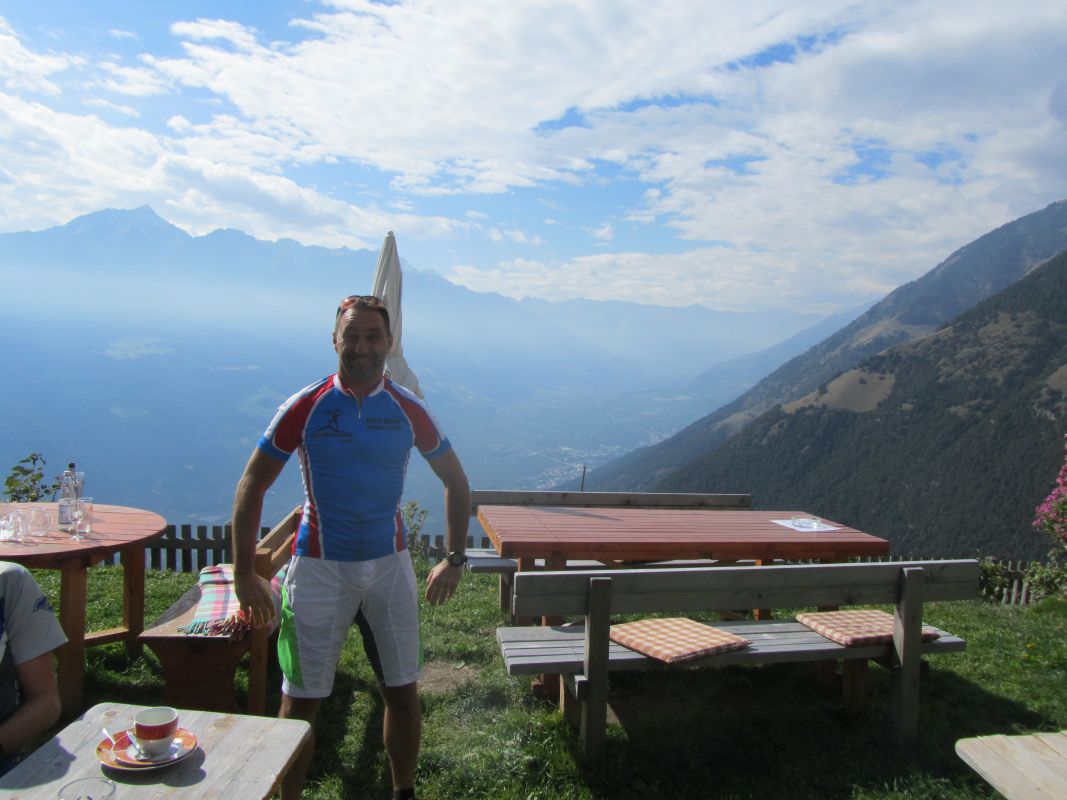Nach einem recht gemütlichen Start in den Tag (die Speiche im Hinterreifen von Roland musst erst noch beim Bikeman repariert werden. Vielen Dank für die schnelle Erledigung!) gings diesmal in Richtung Norden, denn heute wollten wir nach der kühlen Auffahrt von gestern mal die Sonne nicht nur im Herzen sondern auch auf der Auffahrt genießen. Wir nahmen also gemütlich die Auffahrt nach St. Martin im Kofel unter die Räder, nur ab und zu überholt von Bikern, die den angebotenen Shuttle-Service nutzen, um leichter an ihr Ziel zu kommen. Nach für unsere Verhältnisse kurzen, gemütlich auf asphaltieren Wegen zurückgelegten 1150 Höhenmetern kamen wir bei der Jausenstation Oberkaser an, wo wir gleich beschlossen, eine Stärkung zu uns zu nehmen (ja, Stef war dabei) eingelegt haben. Das Mittagessen und auch die Nachspeise in Form eines Kaiserschmarrens waren sehr lecker und können nicht genug gelobt werden. Der von machen bestellte Kaffee wäre aber wohl besser unbestellt geblieben: er hatte sich nämlich dem Geschmack der wohl hauptsächlichen Gäste angepasst und war sehr deutsch. 🙁