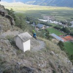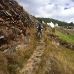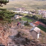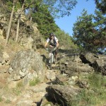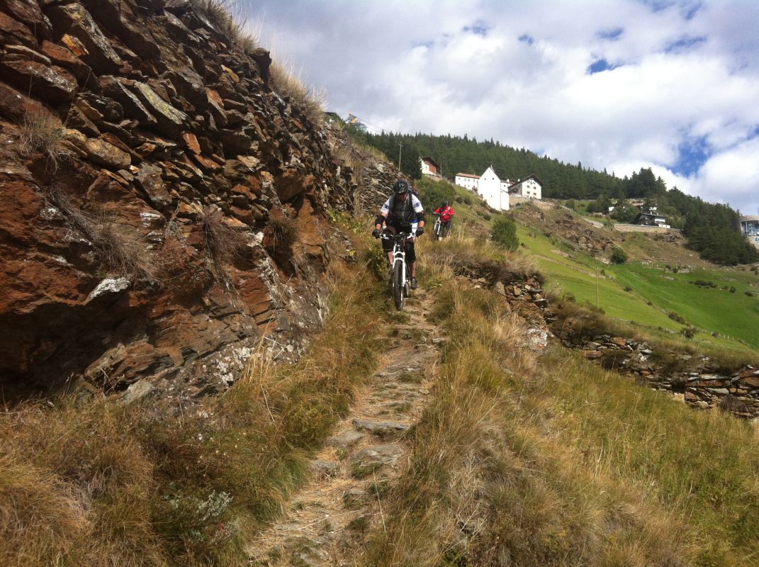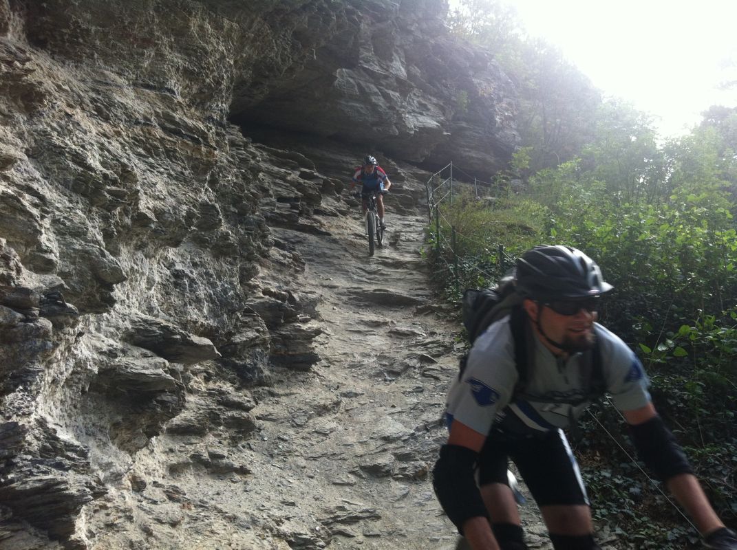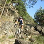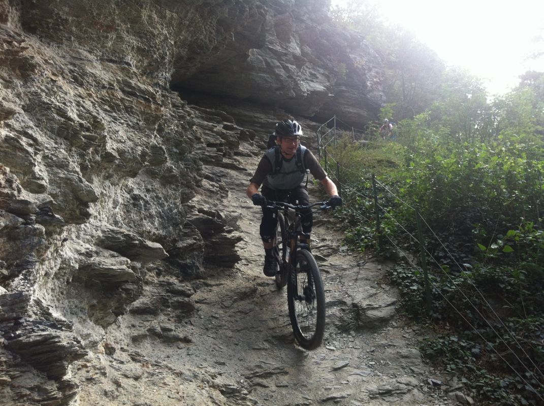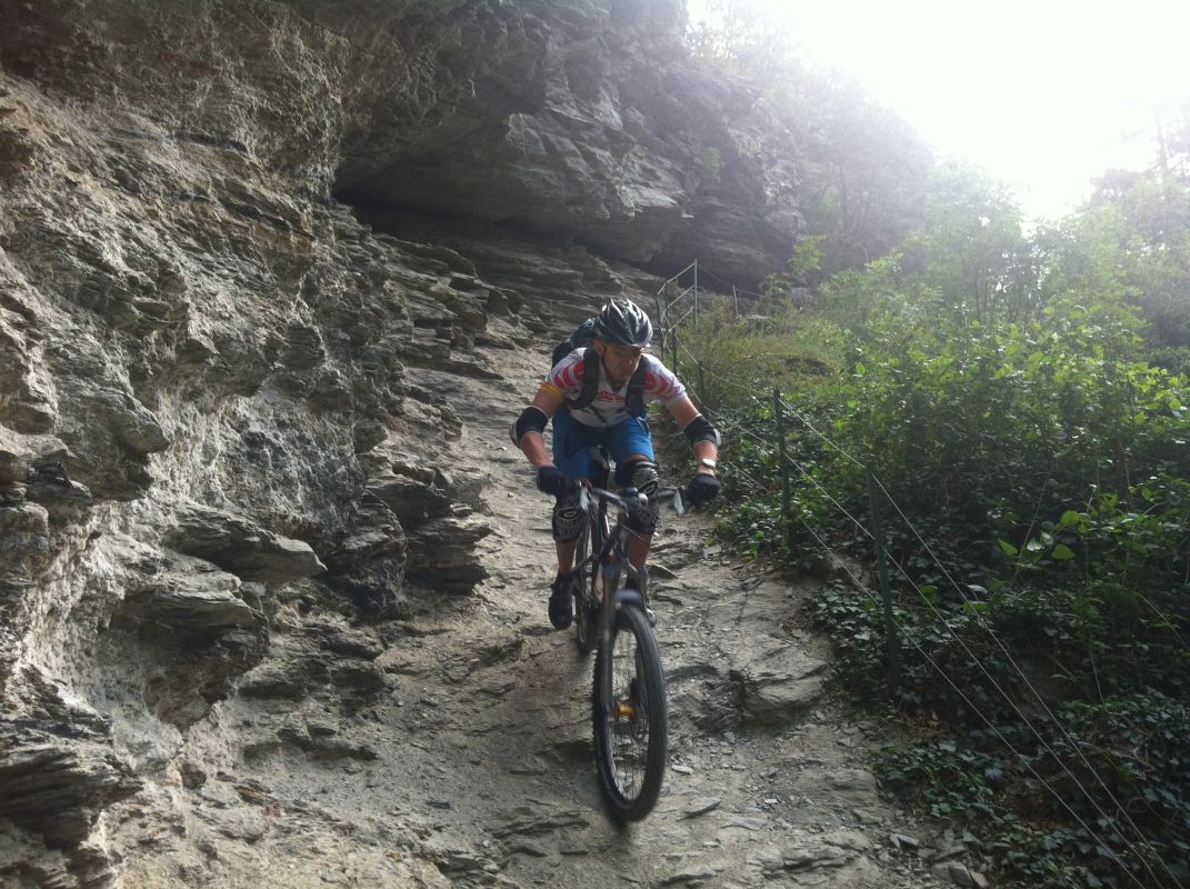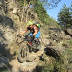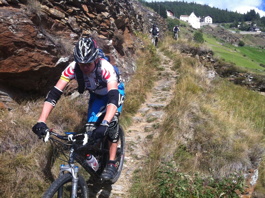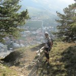 Die Suche nach dem Trail erwies sich jedoch als nicht ganz so einfach als erwartet. Immer wieder zweigten Trails von der Strasse ab, teilweise mit gleichen Wegnummern, teilweise mit Nummern, die wir so auf unserer Karte nicht fanden. Auf gut Glück bogen wir also irgendwann nach links in einen Trail ab, der zum einen recht interessant aussah und zum anderen auch schon ein paar Reifenspuren aufwies. Ganz unfahrbar würde der Weg also nicht werden. Schon nach ein paar Metern zeigte sich jedoch, dass unsere Wahl nicht besser hätte ausfallen können. Der Trail war unbestritten das Highlight des Tages. Immer wieder schwierig, jedoch bis auf eine Stelle alles fahrbar (wenn auch die eine oder andere Stelle Glück brauchte, um bewältigt werden zu können). Aber nicht nur der extrem lässige und anspruchsvolle Trail ließ uns in ein Dauergrinsen verfallen, sondern auch die geniale Aussicht auf Schlanders.