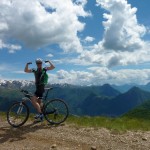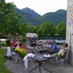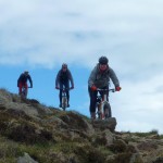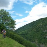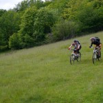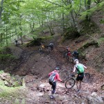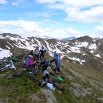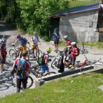 Für die anderen ging es nach wenigen (Anstiegs)metern auf der Straße dann schon wieder auf einen Forstweg, der aber recht bald immer schmaler wurde. Irgendwann endete dieser schmale Steig in einer steilen Wiese, über die wir dann abfahren mussten. Der Trail, der uns die letzten 150 Höhenmeter ins Tal bringen sollte, war nochmal ein Weg für die Bikes mit breiten Reifen und viel Federweg. Technik war hier weniger gefragt, man musste eher in der Lage sein, halbwegs eine Linie zwischen losem Gestein zu finden und sich trauen, ab und zu die Bremsen zu lösen, den Rest erledigte das Gefälle. Hier hatten wir auch noch die einzige Panne der gesamten Ausfahrt, die nicht ein Reifenschaden war: bei Martin löste sich plötzlich das Pedal von seiner Achse. Aber nach einer kurzen Reparatur konnte es auch hier wieder weitergehen und so erreichten wir mal wieder mit einem breiten Grinsen im Gesicht unsere Unterkunft, wo wir noch mit einem Radler bzw. einem Bier auf die erfolgreiche Tour anstießen.