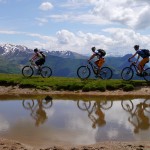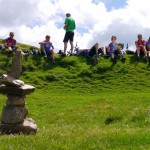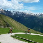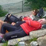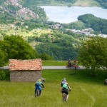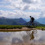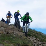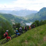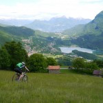 Die Abfahrt war genau das, was wir uns erwartet hatten: teilweise recht schwierig (kurze Abschnitte waren sogar zu schwierig) und dann wiederum gab es Teilstücke, wo wir einfach die Bremse aufmachen konnten. Die nächste längere Pause gab es wieder am Passo di San Lucio, da wir dort warten mussten bis Matthias seinen platten Reifen wieder aufgefüllt hatte. Dann ging es weiter über Wald und Wiesen bis wir wieder zum Forstweg zurückkamen. Diesem folgten wir aber nur ganz kurz, denn schon bald zweigten wir wieder ins Gebüsch ab und auch hier erwartete uns ein interessanter Trail, der sich aber hinter einer kurzen, matschbedingten Tragepassage versteckte. Am Ende dieses Trails gab es dann die zweite pannenbedingte Pause, da sich Roland an einem spitzen Stein seinen Reifen aufgeschlitzt hatte. Der Reifen konnte zwar mit Hilfe eines Müsliriegelpapiers notdürftig repariert werden, aber für Roland war die Ausfahrt hier mehr oder weniger zu Ende und er machte sich langsam und vorsichtig auf der Straße zurück ins Tal.
