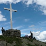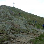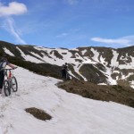 Aber das Wetter war schön und auch sonst sprach nichts dagegen, es zumindest zu versuchen. Und ein bisschen Schnee würde uns auch nicht von unserem Ziel abhalten können. Zunächst folgten wir der Bergstraße nach Buggiolo. Nach etwa 800 Höhenmetern wechselten wir auf einen Forstweg, aber da die Steigung nicht allzu groß war, kamen wir weiterhin gut voran. Am Passo di San Lucio. Hier war eine Pause fällig und um uns zu unterhalten, baute Mampf ein Stoanmandl auf, das wir dann mittels Steinwurf (1 Versuch/Person) wieder zerstören sollten. Da es für einen Treffer am Abend ein Bier geben sollte, war die Anstrengung entsprechend groß (und Mampf schlussendlich um 2 Bier ärmer). Ein kleiner See lud dann auch noch zu einer kurzen Fotosession ein, bevor wir uns endgültig daran machten, die letzten 400 Höhenmeter bis zum Garzirola hinter uns zu bringen. Anfangs ging es noch gut voran, aber schließlich fanden wir den auch für diesen Tag angekündigten Schnee und die fahrbare Spur wurde immer schmaler, bis der Schnee das Fahren schlussendlich unmöglich machte. Also wurden die Bikes geschultert und weiter nach oben befördert. Am geschlossenen Rifugio Garzirola vorbei (zumindest sah es beim Vorbeifahren geschlossen aus), ging es zum nächstgelegenen Gipfelkreuz. Wie sich herausstellen sollte war das zwar nicht der Garzirola selbst, sondern der etwas niedrigere Sasso Basciotta, aber das war uns in diesem Moment egal. Hier wurde nun die lang schon überfällige Mittagspause eingelegt.