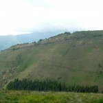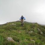 Nachdem wir das Mittagessen verspeist und bezahlt hatten (wir hatten schon öfter besser gespeist), beschlossen wir, uns auf den Weg zu machen, in der Hoffnung, dass uns bei der Abfahrt endlich warm werden würde. Das Wetter hatte sich in der Zwischenzeit leider nicht gebessert und so machten wir uns unter den wachsamen Augen des Hüttenwirts und seines Hundes im Nebel auf die Suche nach dem Trail. Wenn der Weg auf der Karte nicht eingezeichnet gewesen wäre, dann hätten wir ihn wohl nie gefunden, denn einen Wegweiser suchten wir am Weganfang vergeblich. Und der Weg hatte es in sich: es lag aber weniger an seiner generellen Schwierigkeit, sondern hauptsächlich daran, dass er ziemlich genau der Falllinie folgte und dementsprechend steil war. Schon nach wenigen Minuten musste ein erster Zwischenstopp eingelegt werden, damit die inzwischen wieder überflüssig gewordene Kleidung wieder in den Rucksack gepackt werden konnte.