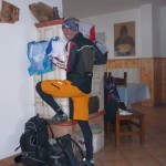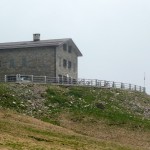 Wir anderen machten uns auf in Richtung Rifugio Croce di Campo. Die Richtung war die gleiche, die wir auch schon am Vortag eingeschlagen hatten, nur lag unser Ziel diesmal etwas weiter östlich. Die ersten 800 Höhenmeter waren nicht ganz so anstrengend wie das, was noch folgen sollte, folgten diese doch wieder der teilweise schon vom Vortag bekannten Bergstraße. Als in San Nazarro der letzte Anstieg zum Rifugio begann, wurde es unangenehm. Der Weg startete recht unscheinbar: es war immerhin noch geteert. Also kein Forstweg und auch keine Betonrampe. Trotzdem steil. Sehr steil sogar. Vermutlich war jeder froh um eine leichte Übersetzung und ich bin mir sicher, dass bis auf wenige Ausnahmen jeder seinen leichtesten Gang benutzt hat. Die Motivation erhielt zusätzlich noch dadurch einen Dämpfer, dass wir umso tiefer in eine Nebelschicht eintauchten, je weiter wir nach oben kamen. Das führte dazu, dass wir auch das Rifugio erst im letzten Moment erblickten. Nur die Schnelleren unter uns schafften es, noch vor dem Nebel das Schutzhaus zu erreichen. Dieser vermeintliche Vorteil erwies sich aber im Nachhinein als Trugschluss, denn der Empfang im Rifugio Croce del Campo war nämlich ziemlich frostig. Das lag einerseits am Wirt selber, der eine recht eigenwillige Persönlichkeit hatte und andererseits daran, dass die Temperaturen im Inneren nur marginal über den Außentemperaturen (8° Celsius) lagen Der mitten im Raum stehende Kachelofen gab leider kaum Hitze ab und zu allem Überfluss erschien dem Wirt die Temperaturn sowieso als zu hoch, denn er hatte in der Küche auch noch die Tür ins Freie ständig offen, was bei jedem Besuch derselben einen Schwall kühle Luft in den Gastraum kommen ließ.