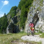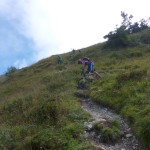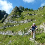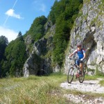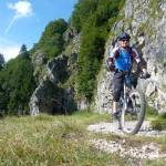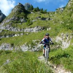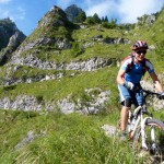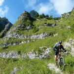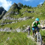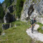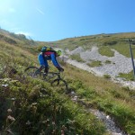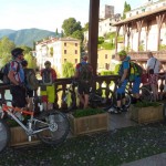 Gestärkt und motiviert machten wir uns dann an die Abfahrt. Diese hatte es auch gleich in sich. Es gab keine Möglichkeit, sich langsam an den Trail zu gewöhnen, sondern dieser zeigte sich gleich von seiner schwersten Seite. Einzelne Teilstücke mussten sogar geschoben werden. Viel Glück hatte in diesem Bereich Philipp: Er stürzte und blieb unverletzt, letzteres aber nur deswegen, weil er sich zur Landung den einzigen Grasfleck inmitten einer steinigen Fläche „ausgesucht“ hatte. Nicht mehr ganz so schwierig, aber dennoch immer wieder an der Grenze zum Fahrbaren führte uns der Trail fast 400 Höhenmeter weit nach unten, wo wir schließlich für kurze Zeit wieder festen Untergrund in Form von Asphalt unter den Rädern hatten. Aber die Entspannung (und damit aber auch der langweilige Teil der Abfahrt) währte nur kurz und schon sehr bald bogen wir wieder in einen Feldweg ab, der in den erwarteten 152er-Trail mündete. Dieser führte uns spektakulär am Berg angelegt zunächst wieder bergauf, sodass die Sättel wieder nach oben schnellten. Ein letztes Mal an diesem Tag mussten Kraftreserven mobilisiert werden, dann konnten wir wieder vom Bergauf- in den Bergab-Modus wechseln. Technisch zwar nicht allzu schwierig, aber dafür immer noch absolut spektakulär führte uns der letzte Trail des Tages wieder in Richtung Bassano, wo wir nach einer kurzen Besichtigung der alten Brücke mit einem Bier auf die erfolgreiche erste Tour anstießen.