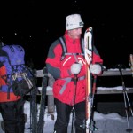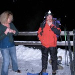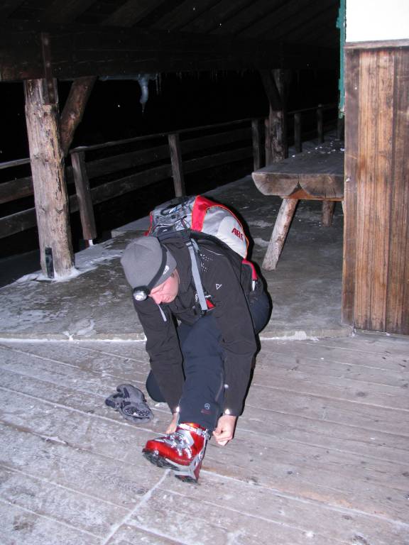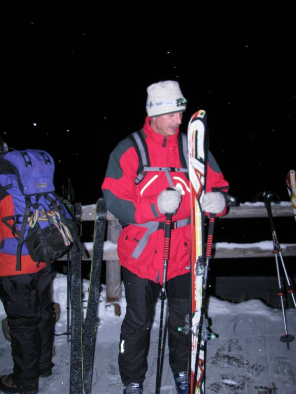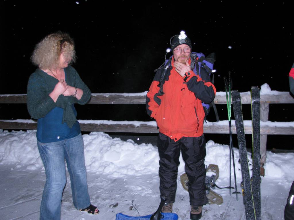 Also ging es am Abend auf einer leicht angezuckerten Straße (der Schneefall vom Nachmittag hatte zum Glück aufgehört) wieder bis zur Gluckserhütte. Dort wurden wiederum Ski bzw. Schneeschuhe untergeschnallt und es ging los. Auch wenn es recht kühl war (wir starteten bei minus 6 Grad) und unser Tempo etwas niedriger als zwei Wochen zuvor, so wurde uns recht bald warm. Schon recht bald war klar, dass wir auch diesmal einen Platz in der Hütte zu reservieren hätten brauchen, denn allzu viele Leute waren nicht am Weg zur Tulfein Alm. Dort wurden wir wie schon gewohnt herzlich empfangen und bewirtet. Diesmal waren wir jedoch gewarnt: Keiner hatte sich vor der Abfahrt den Magen vollgeschlagen und so konnten wir die großen und sehr guten Stück Kuchen ohne Probleme verspeisen.